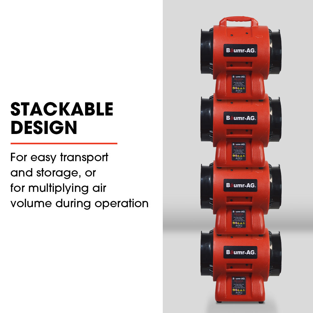 Designed with portability in mind, the compact Baumr-AG Air Blower has a carry handle and only weighs in at 7kg. It can conveniently be stacked up to 4 high for easy storage or transport, or to multiply air volume.