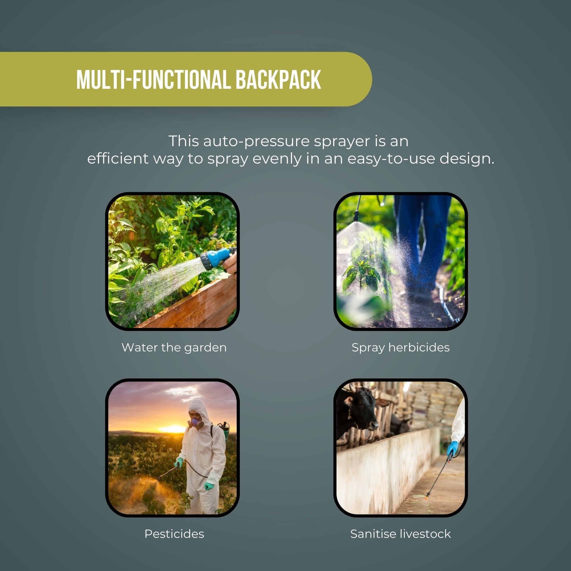 This high quality, easy-to-use, multi-functional and ergonomically designed backpack sprayer has been designed and manufactured in response to the need for efficient tasks for home and public gardens, farms and allotments of small to medium size holdings. This auto pressure sprayer ensures even distribution whether you are fertilising your garden, spraying herbicides or pesticides or sanitising any areas.
