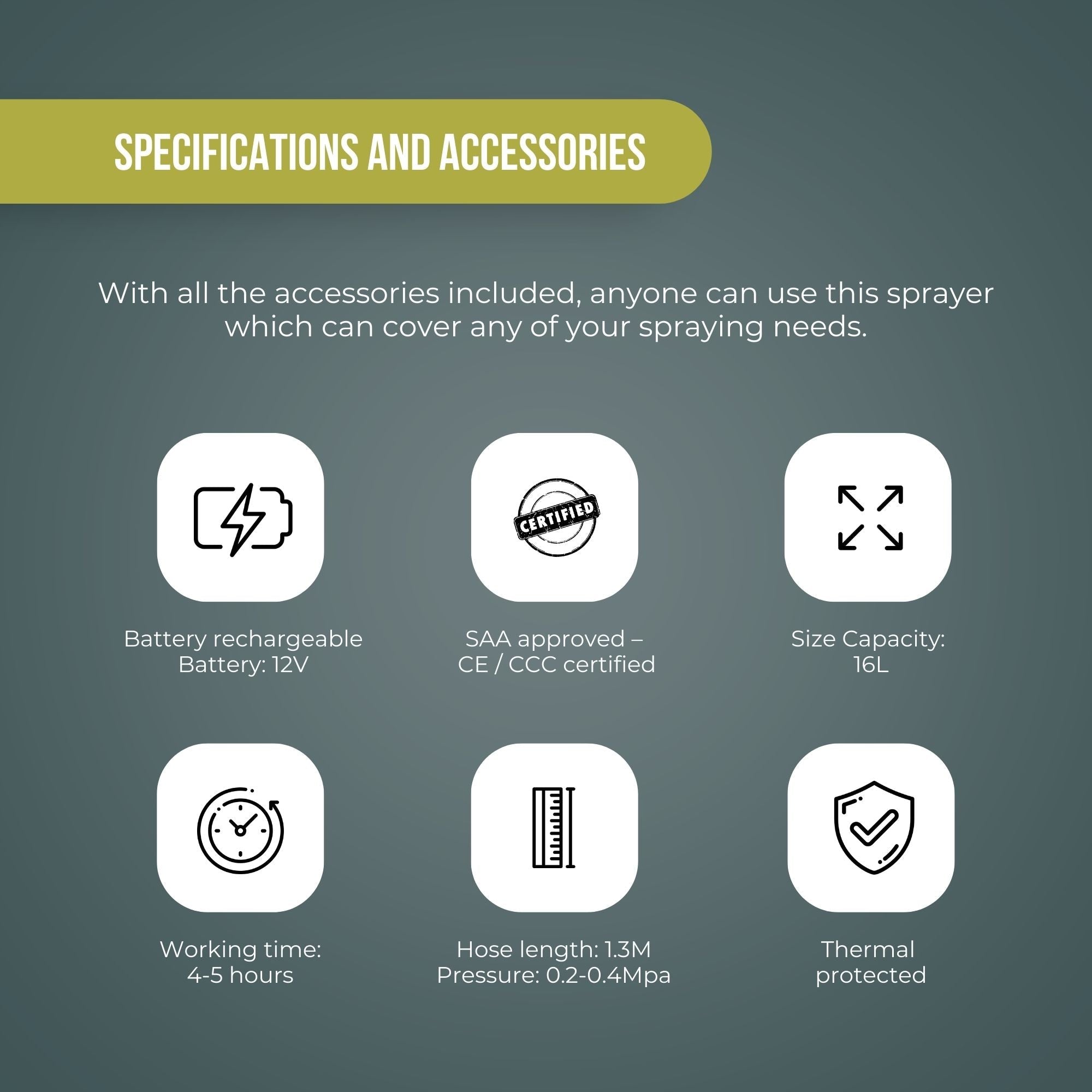 - Size Capacity: 16L Agricultural Standard