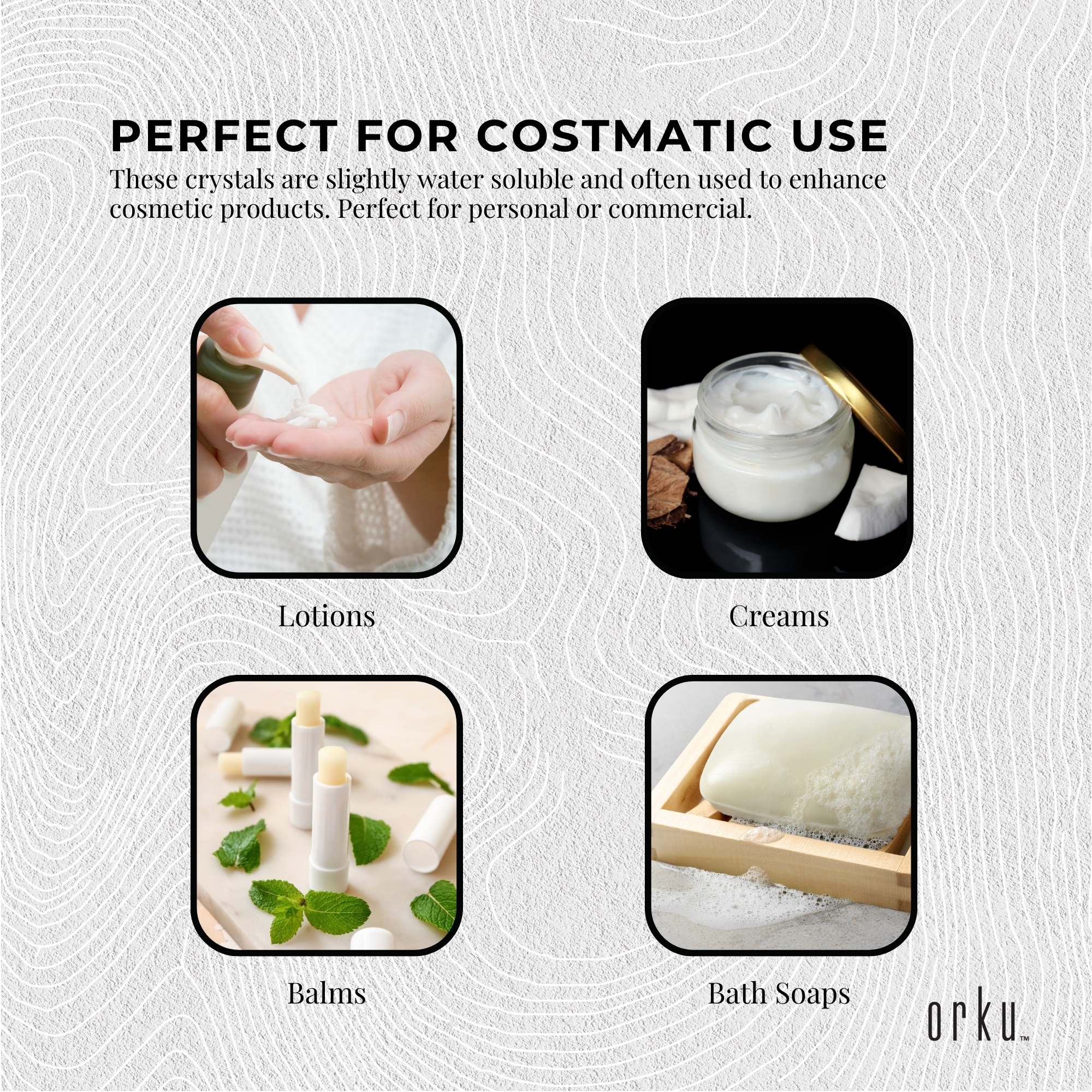 These crystals are slightly water soluble and often used to enhance cosmetic products such as lotions, creams and balms. Menthol is derived from a mint source and can be used as a flavouring agent.