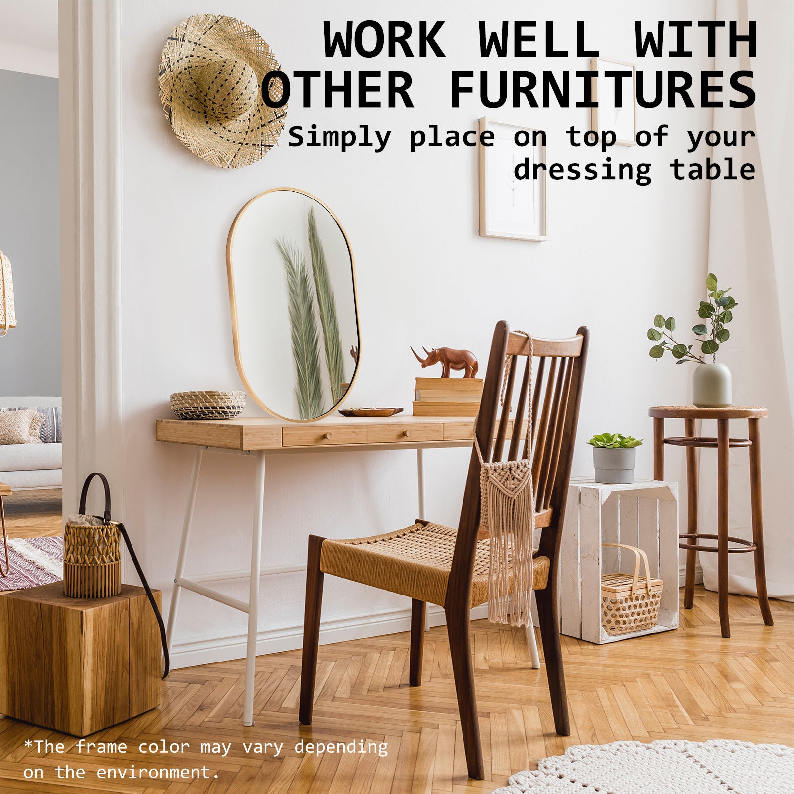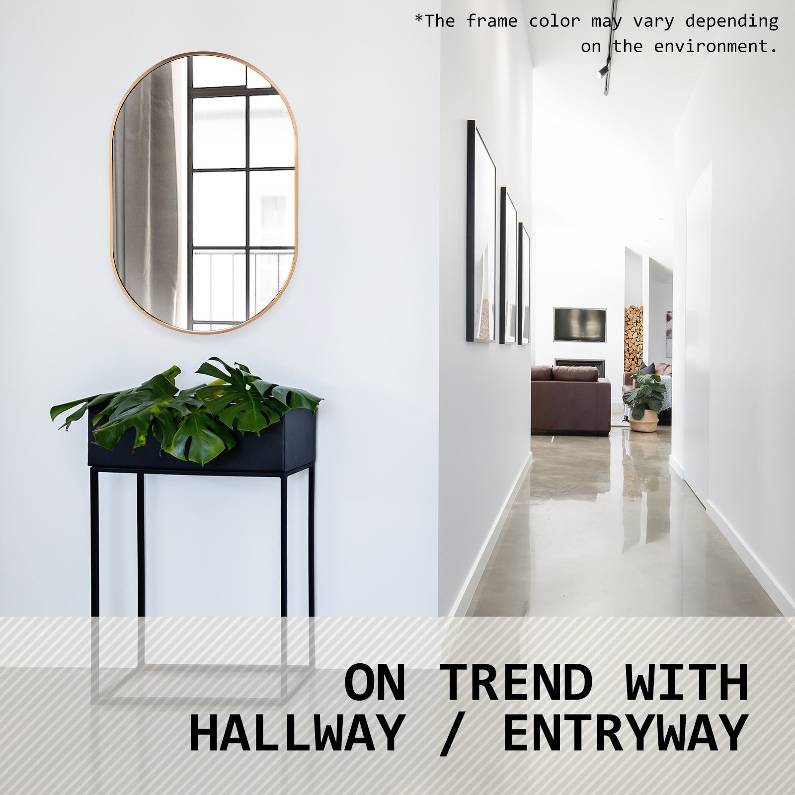Please note it's neither brass gold nor rose gold. Our aluminum mirror, part of the gold color theme, has a unique shade within the gold spectrum. The frame color may vary with light due to aluminum's reflective nature.