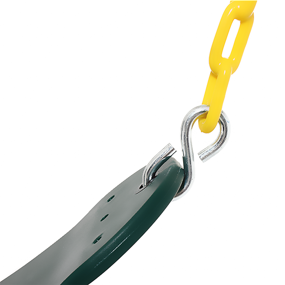 Designed with an eye-catching yellow plastisol coating to prevent finger pinches, these sturdy 2/0 zinc-plated chains should last for years. The copolymer plastic seat is both comfortable and safe. With their 300-pound weight limit, even the grownups can get in on the action. Enjoy hours of family fun with these rugged swings. Use them with low-friction swing hangers for maximum safety and enjoyment.