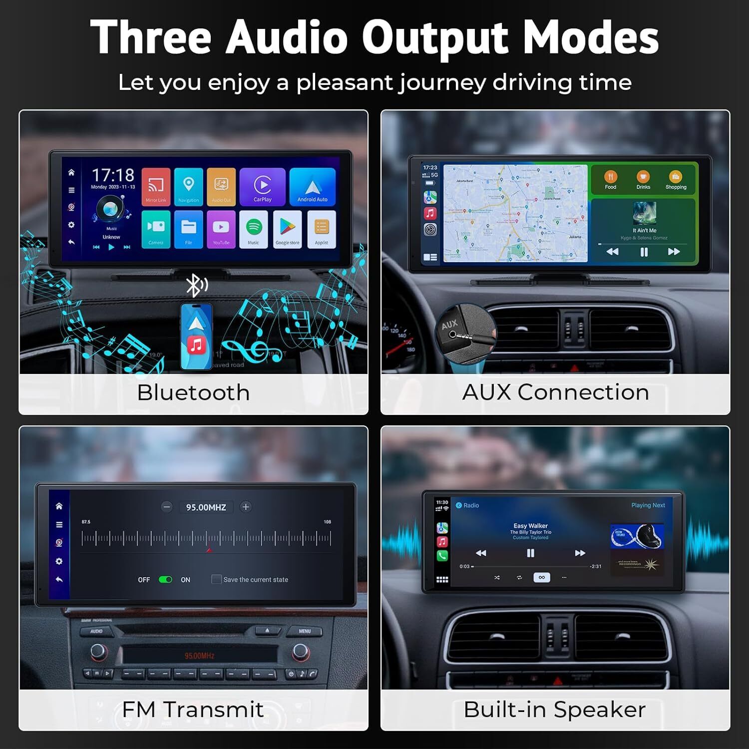 [AUX / FM Transmission]: This portable carplay screen for car has built-in speakers, but for louder sound you can transmit audio to your car speakers by either FM frequency syncing or connecting the included AUX cable to your car's AUX input jack. Suitable for almost all kinds of cars, trucks, caravans, vans, trailers, campers, etc.