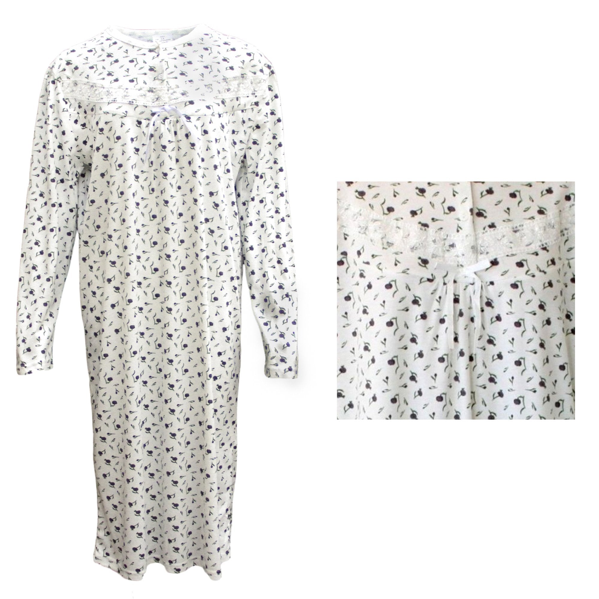 100% Cotton Women Nightie Night Gown Pajamas Pyjamas Winter Sleepwear PJs Dress, Purple Flowers, 14