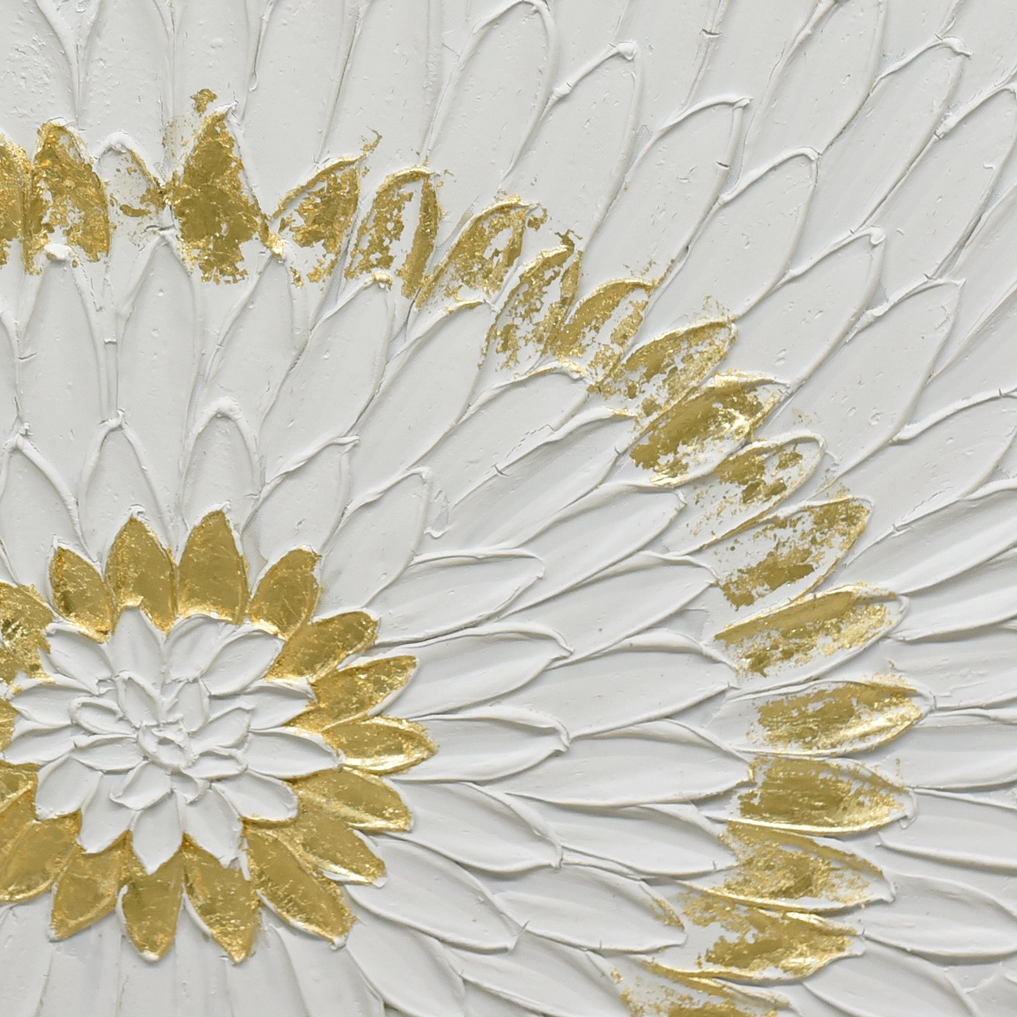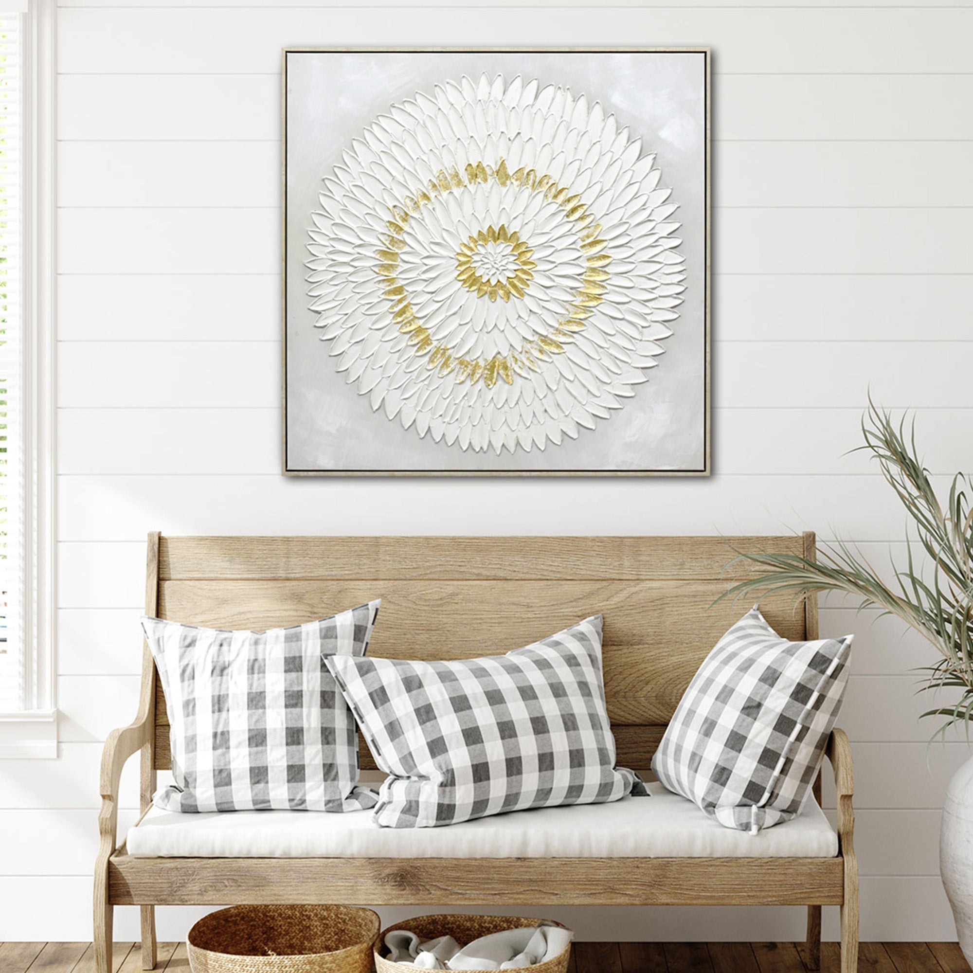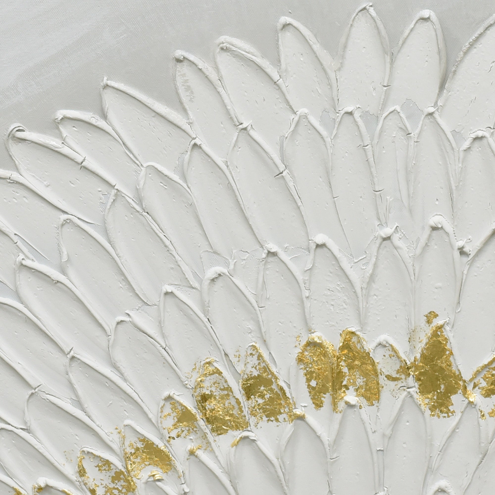 An evocative hand-painted masterpiece, "Lustrous Celestial Harmony" spans an impressive 100cm x 100cm canvas, framed beautifully with light wood that complements the primary white palette. The artwork captivates with a mesmerizing circular design, invoking the cyclical nature of life and the universe. At its core, two intertwined gold rings emerge, symbolizing unity and eternal bond. Interspersed throughout are delicate petal motifs, representing nature's bloom and ephemeral beauty. Soft, ethereal feathers dance around the periphery, adding an essence of freedom and fragility. The thick texture technique utilized gives depth and dimension, inviting the viewer to get lost in its myriad intricacies. Every brushstroke tells a story, making "Lustrous Celestial Harmony" an enchanting conversation piece for any space.