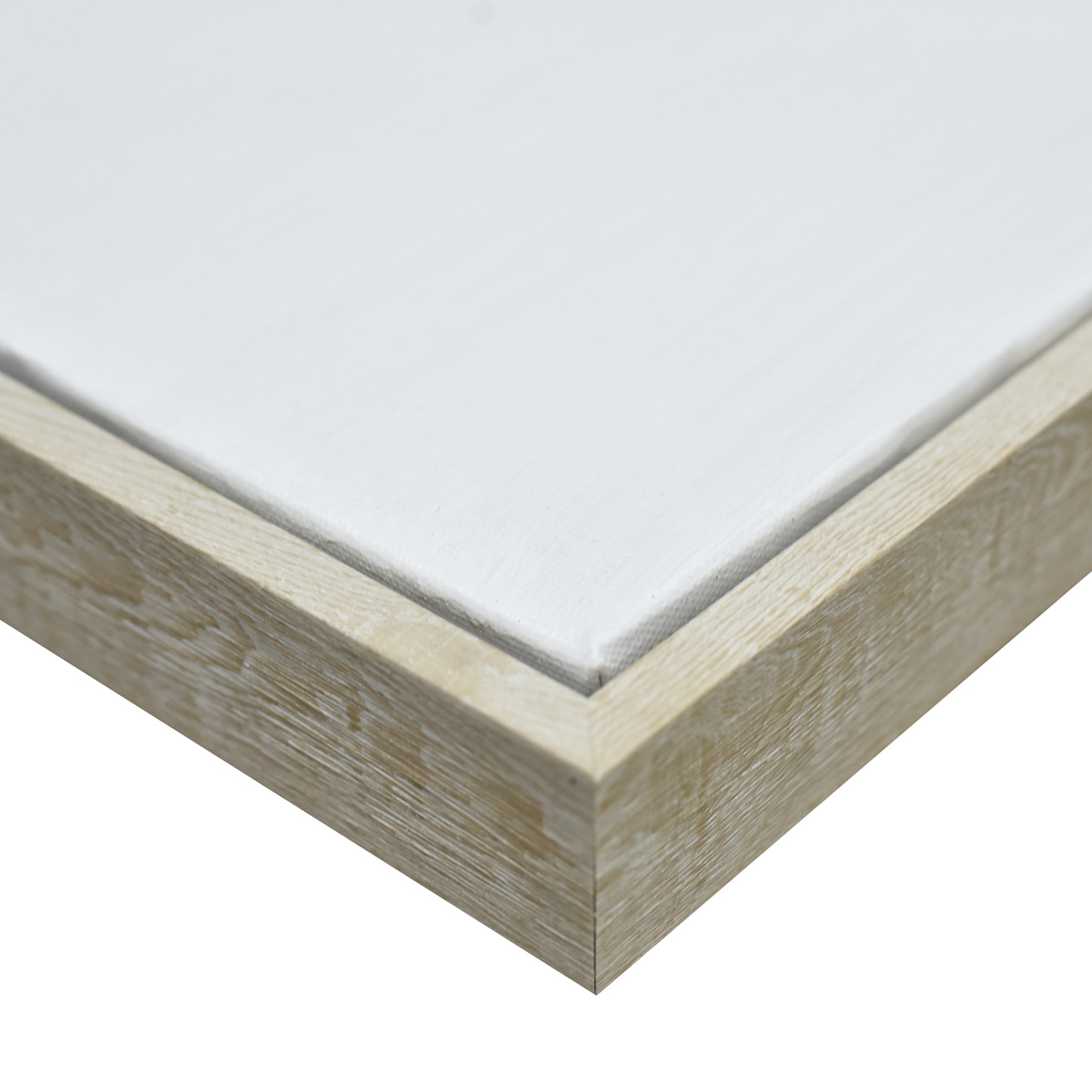 Stretched and gallery wrapped around a wooden stretcher and finished with a floating frame. There is a gap between the frame and print, which creates the floating effect and literally makes the canvas print stand out even more.