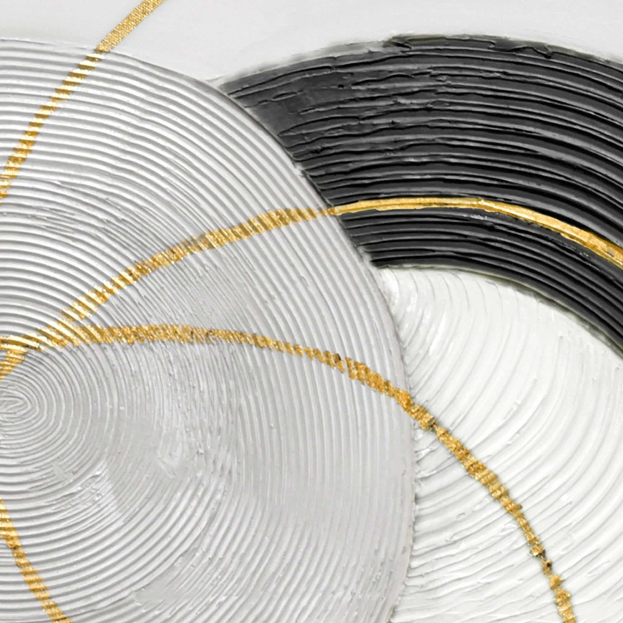 Dive into the mesmerizing world of "Martian Geometrics," a 100cm x 100cm artwork that masterfully blends abstraction with geometry. This hand-painted creation showcases five solid circles, each adorned with thick, circular groove textures. The harmonious palette of grey, brown, white, black, and beige gives each circle its own distinct character, creating a captivating visual narrative. Overlaying this base are three ethereal golden-outlined circles, adding a touch of opulence and intrigue to the composition. Set against a very light grey backdrop, these elements come together in a dance of color, form, and texture. Encased in a light wood frame, this piece, with its thick textured details, is a testament to the beauty of abstraction and the elegance of geometric design.