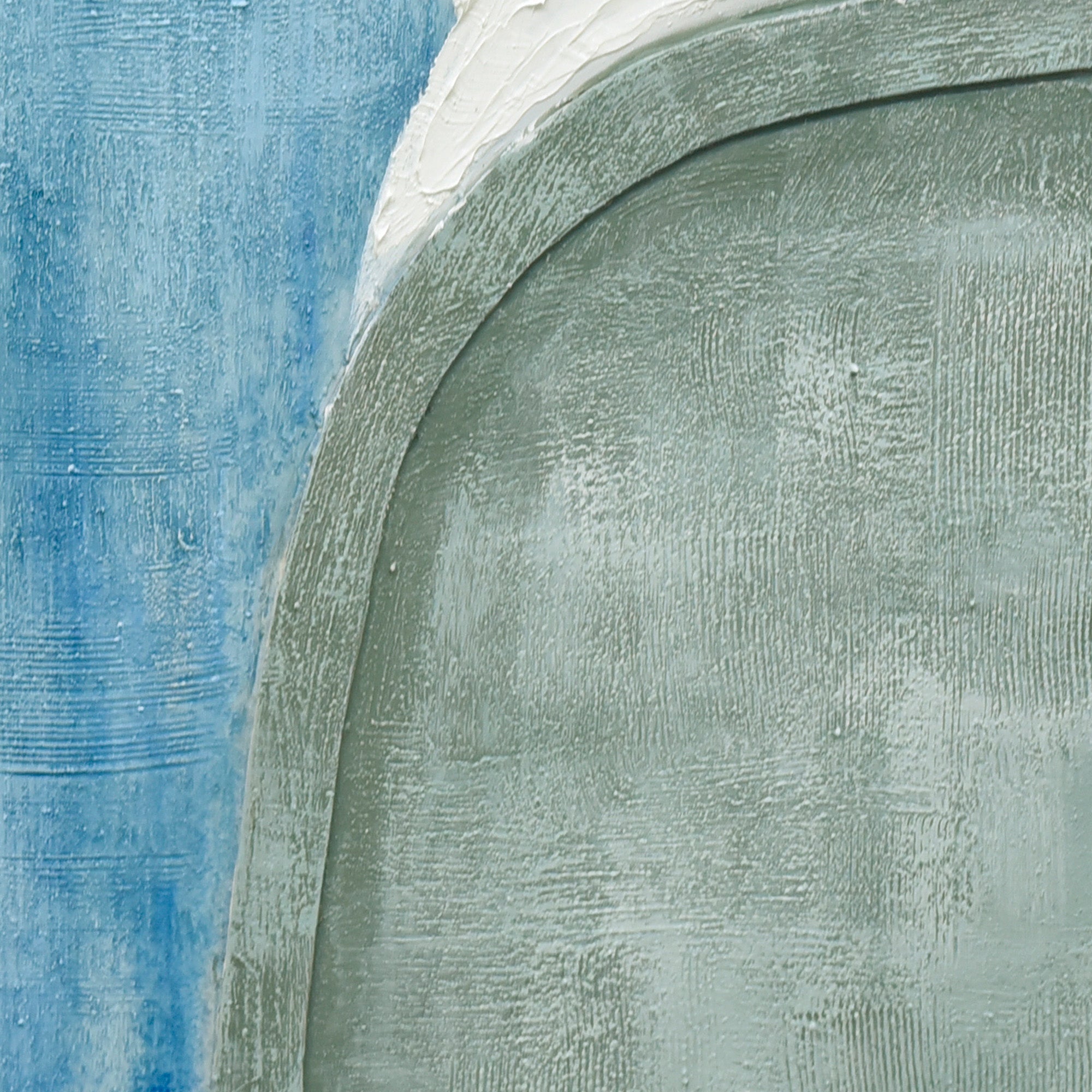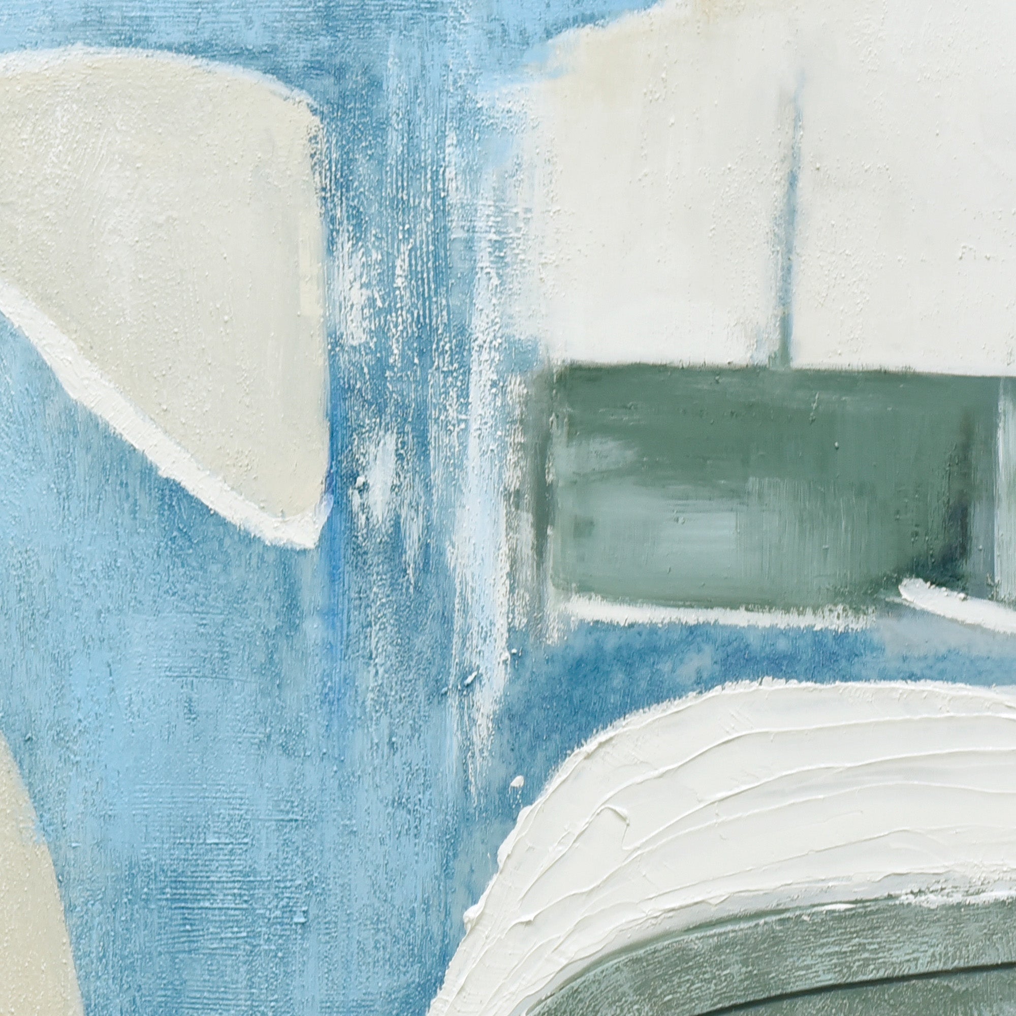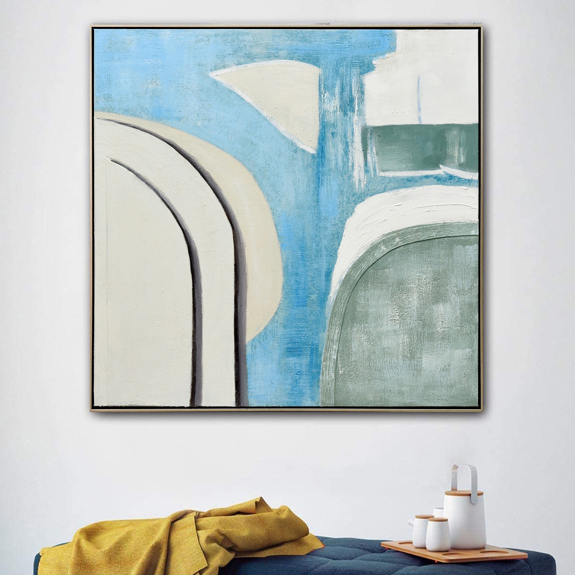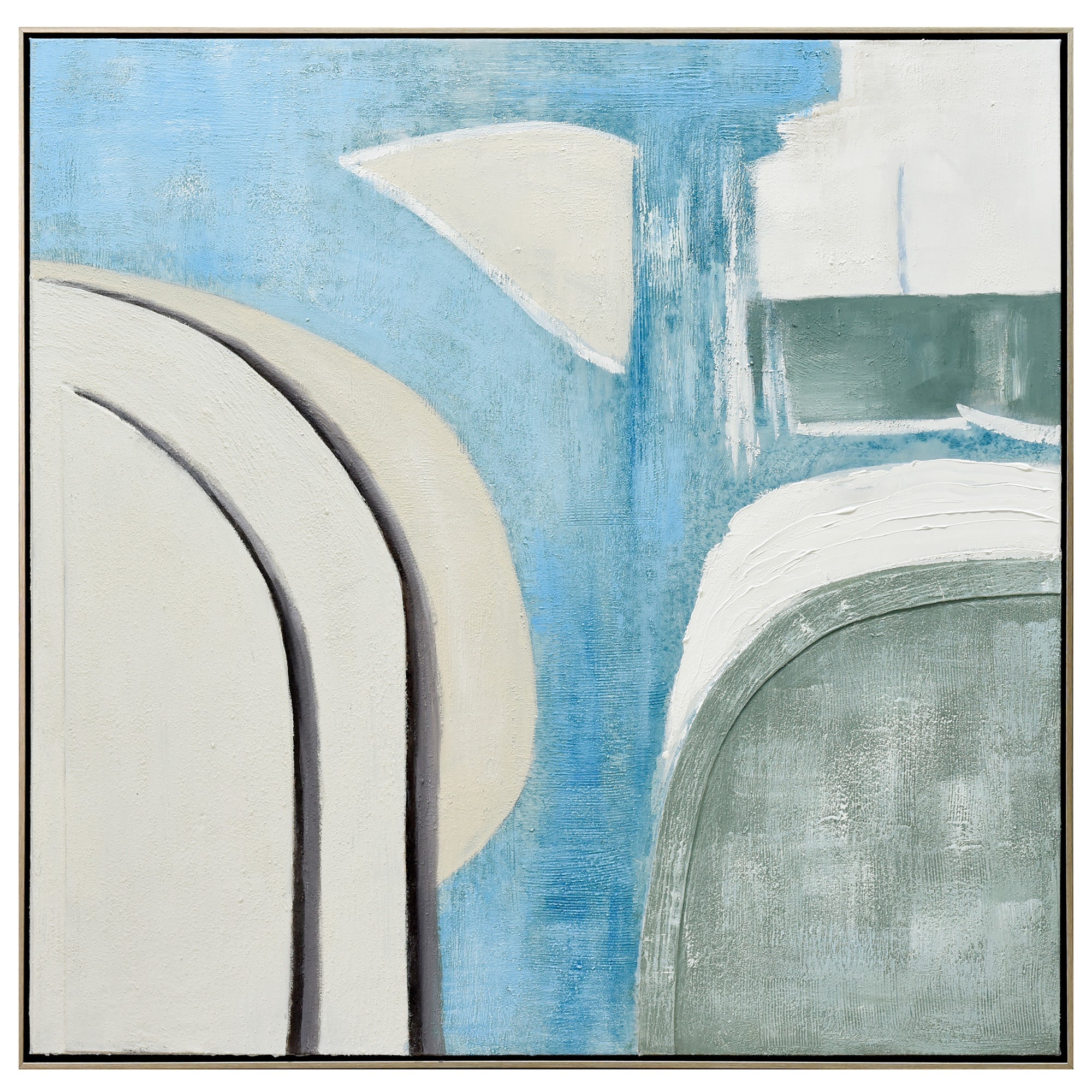 "Whimsical Whorls" is a 100cm x 100cm hand-painted masterpiece that invites viewers into a dreamy world of abstraction. A symphony of curves dance across the canvas, each rendered with meticulous attention to detail, some details include using 3D material. The harmonious blend of white, cream, blues, and sage green creates a soothing visual palette, evoking feelings of serenity and contemplation. The white-washed technique further enhances the ethereal quality of the artwork, giving it a soft, almost ephemeral appearance. Set against a luxurious champagne frame, this piece masterfully combines form, color, and texture to create a captivating visual experience. With its intricate patterns and gentle tones, "Whimsical Whorls" is a celebration of the beauty of abstraction and the power of hand-painting.
