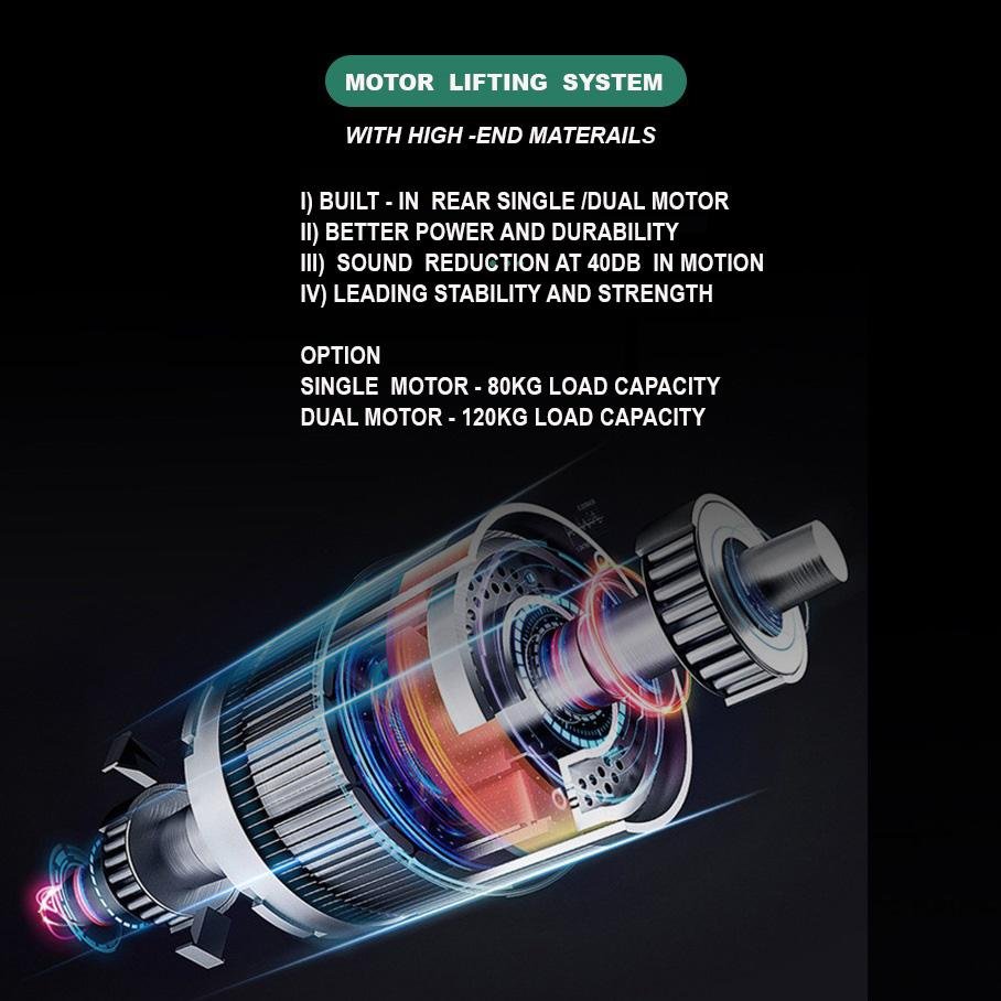 Amazingooh provide selection of? single/dual motor lifting system. This translates to fast, smooth and quiet operation, with the added benefit of superior durability and up to 120kg (Dual motor) capacity. Furthermore, unlike other models on the market, the motors are neatly and safely enclosed .