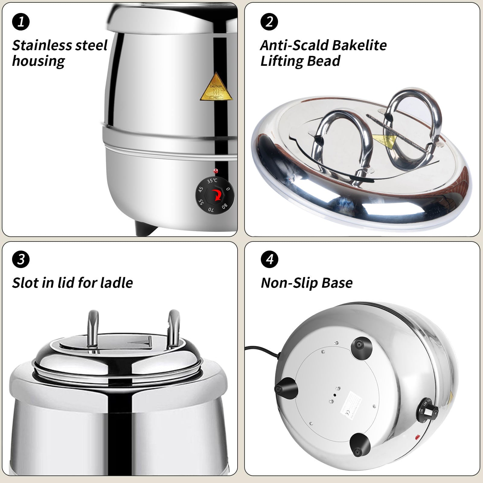With a generous 13.7-quart (13L)capacity, this soup warmer is perfect for larger gatherings. Constructed with food-grade stainless steel inner pot, it ensures durability and safe food handling.