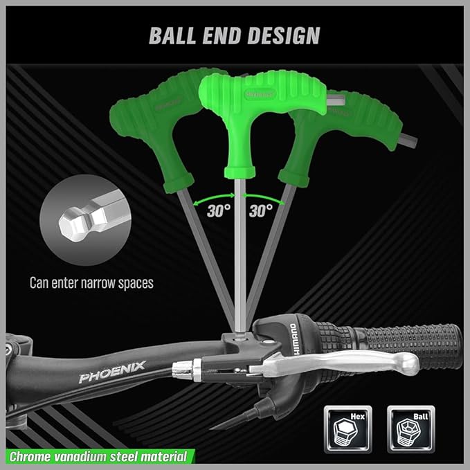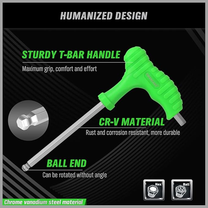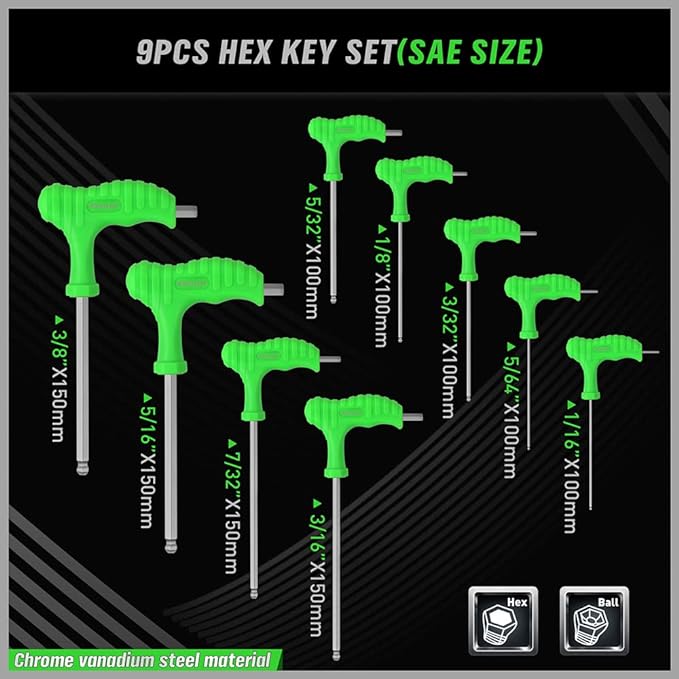 18-Piece T-Handle Allen Key Set, Inch/Metric Long Arm Ball End Hex Key Wrench Set, MM(1.5mm-10mm) SAE(1/16"-3/8")