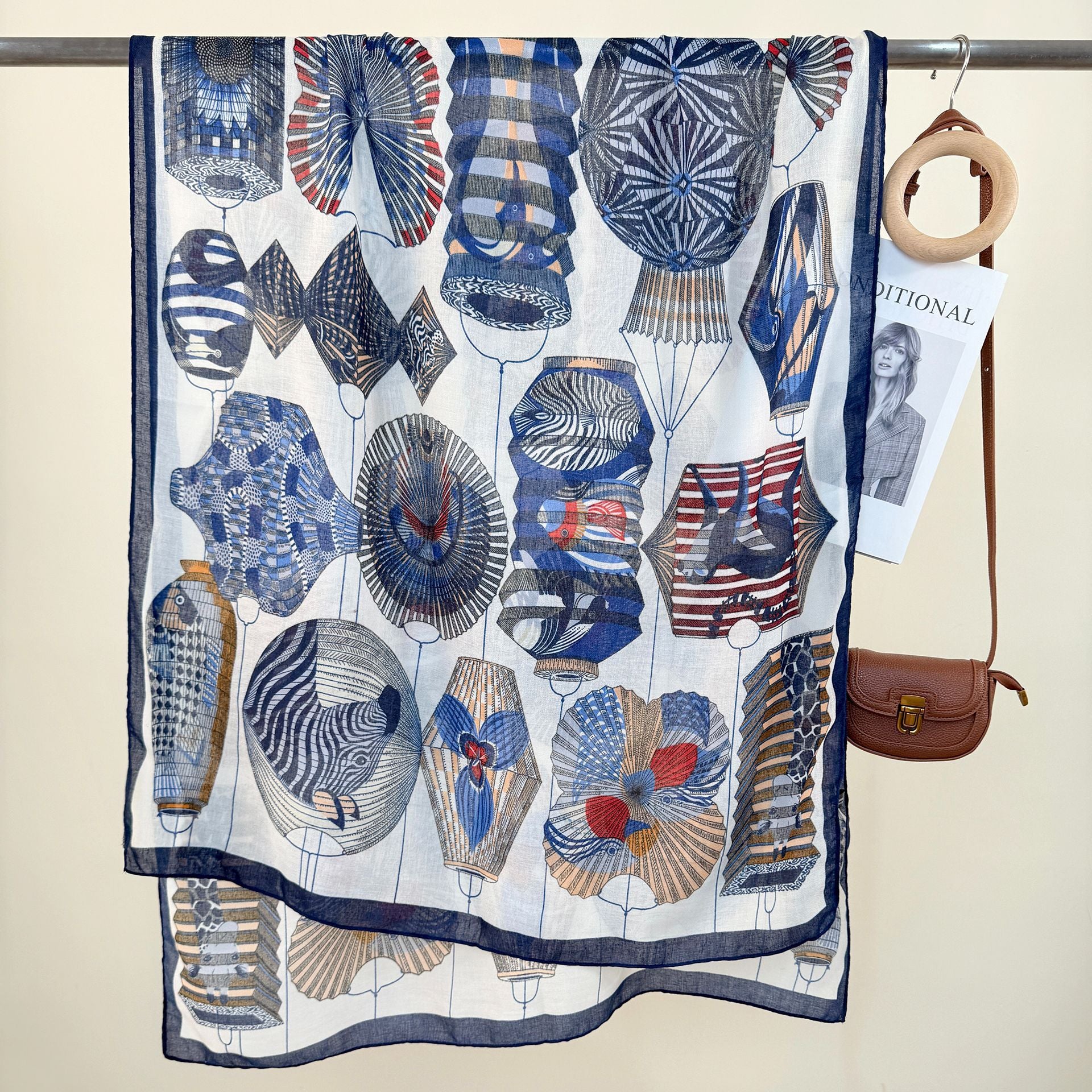 2-Piece Blue Border Retro Lantern Print Scarf - Fashionable Niche Design for Women