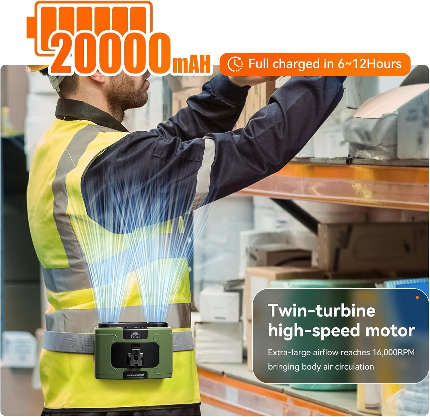 • 40H Long-lasting Cooling: This waist fan features a built-in 20000mAh rechargeable battery and a powerful motor, providing powerful but comfortable airflow. It can last up to 8-40 hours on a single charge. Perfect for use in jobsite outdoor garde