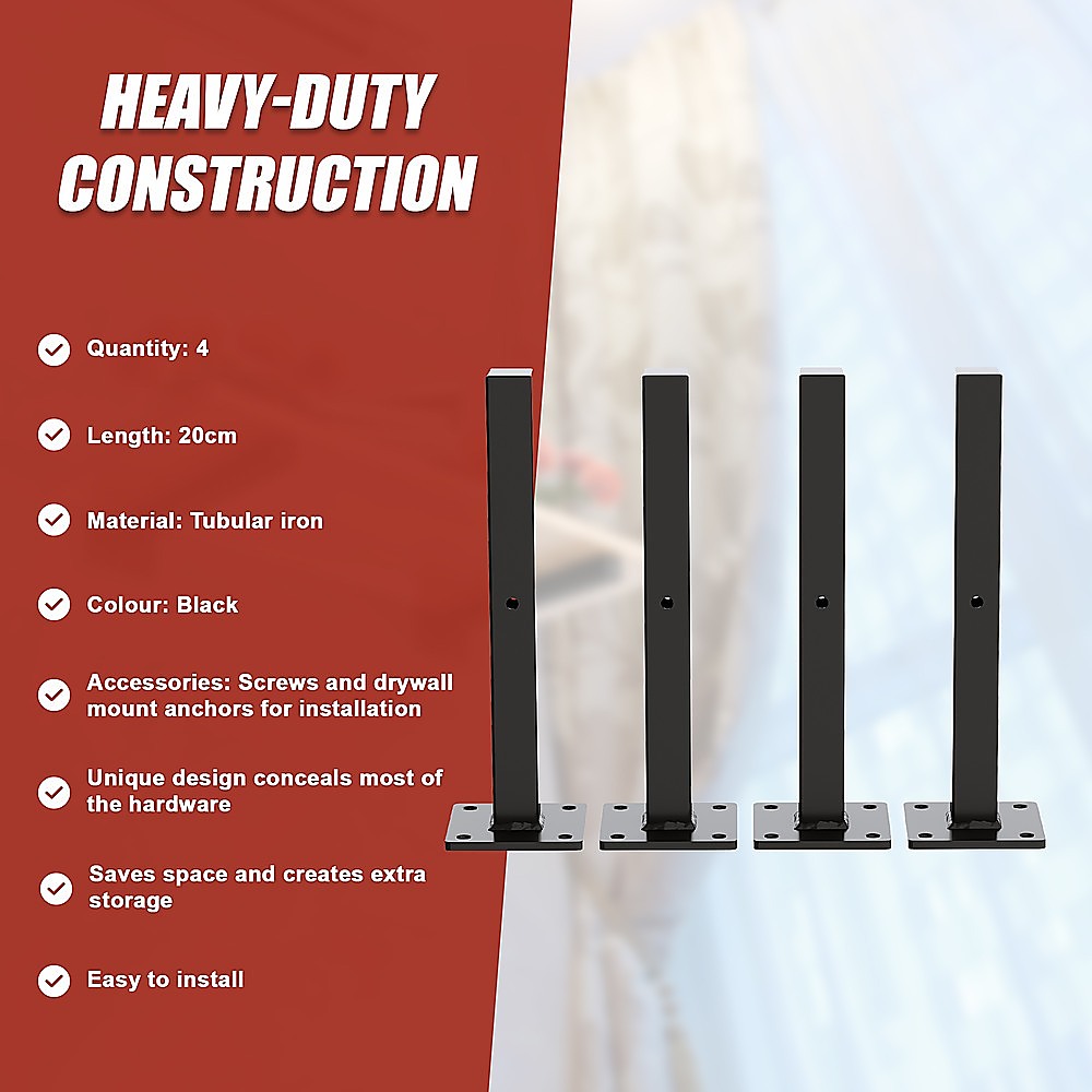 20cm Floating Shelf Brackets Industrial Metal Shelving Supports 4-Pack - Black