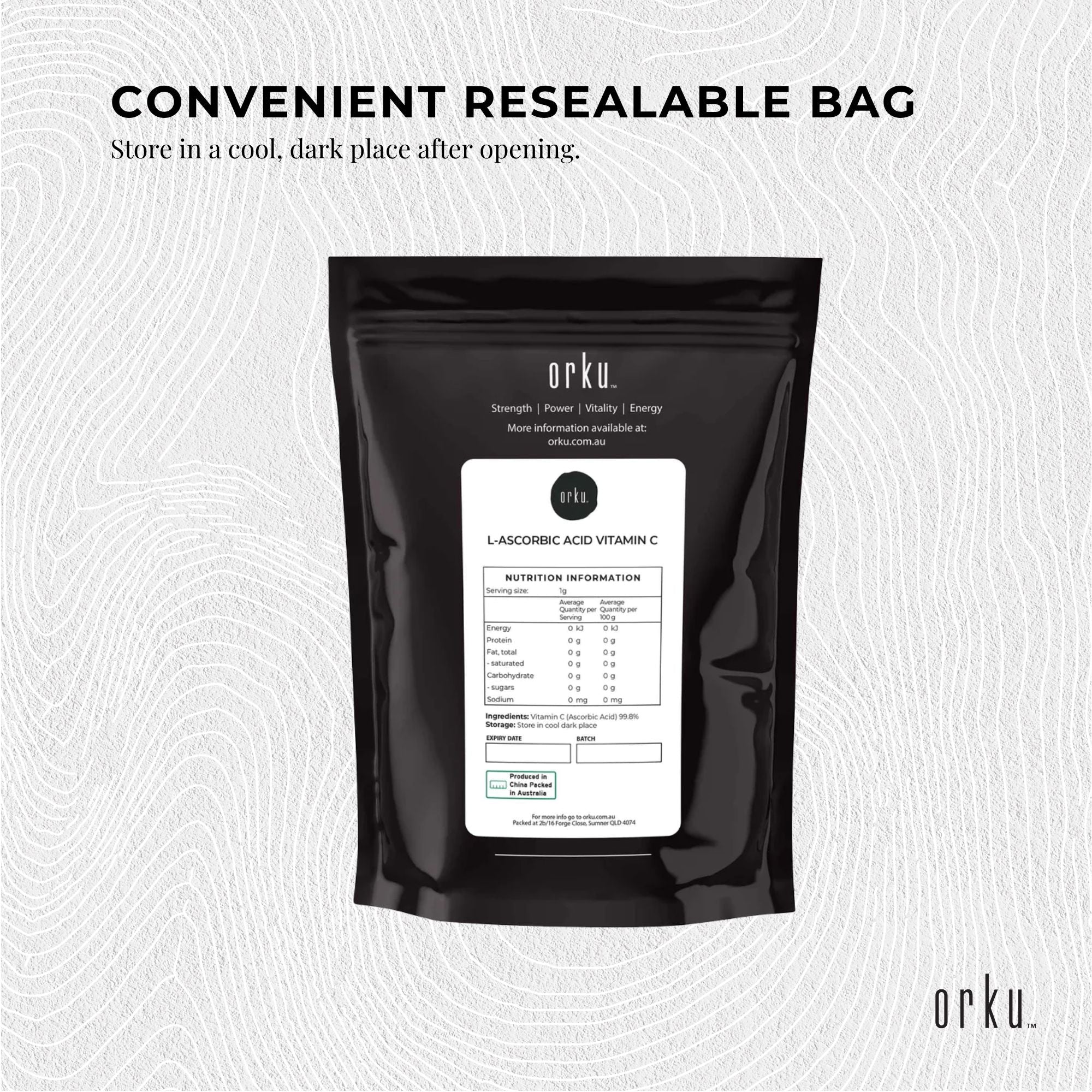 Pure Vitamin C Powder available in in resealable bags.