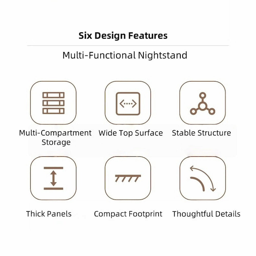 This Nordic-style bedside table features a modern minimalist design, perfectly combining warm white with natural wood grain texture, creating a cozy and comfortable visual effect. The upper section is designed with two-tier open storage areas, including a tray-like top layer and a spacious middle layer, with an additional storage compartment on the right side. The bottom section features one drawer with a natural wooden round knob, simple yet warm. The elegant curved side design adds a soft touch, while the four small wooden round legs elevate the overall height, making floor cleaning easier. This compact bedside table is perfect for small bedrooms with limited space.