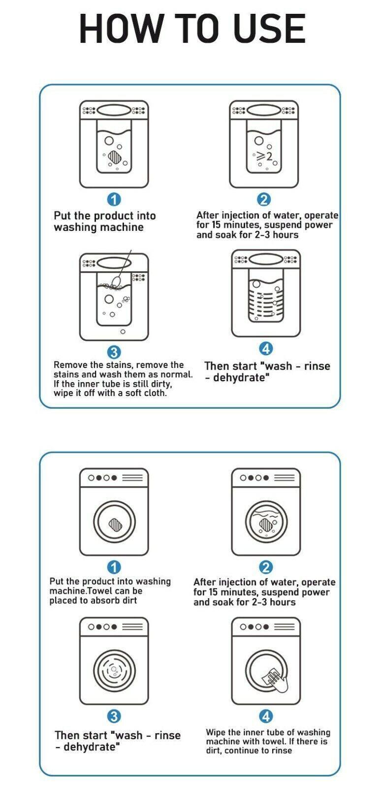 Functions: Cleans and decontaminates, removes stains and protects the washing machine.