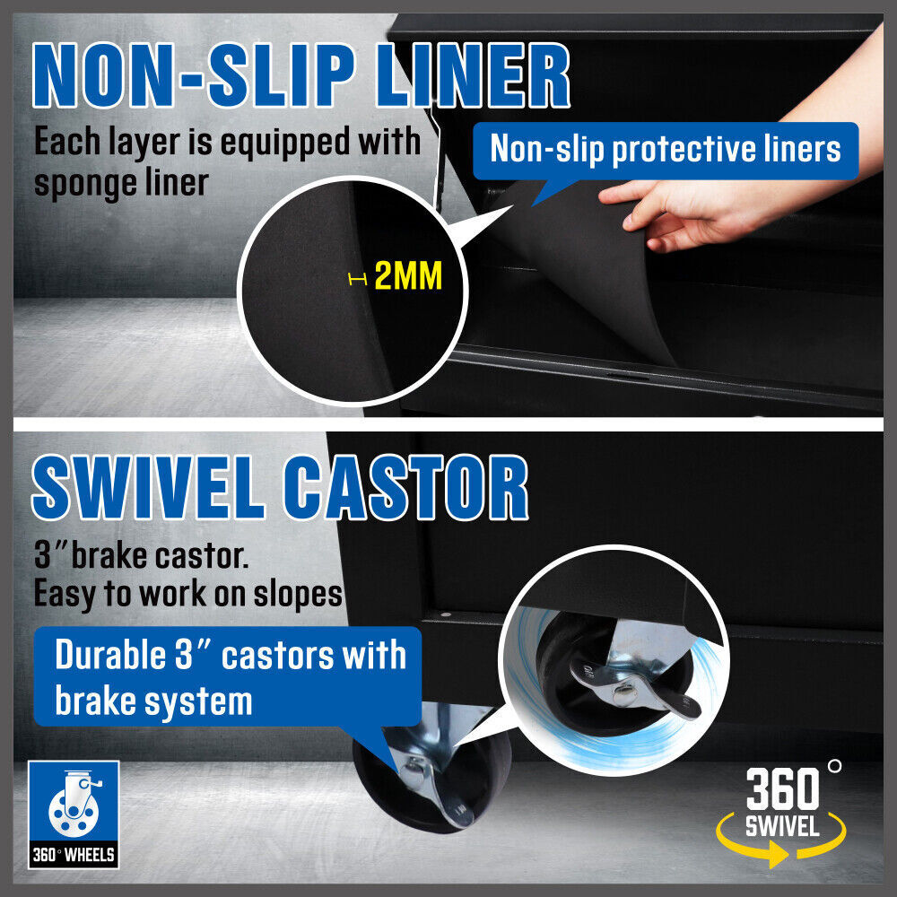 Made of powder coated steel, our tool trolley is designed to keep your valuable tools in place and has 7 drawers specifically designed to meet a variety of tool sizes. From top to bottom, each drawer slides in and out easily, with ball bearings coupled to metal drawer rollers. Each drawer is lined to protect your tools and prevent them from moving. In addition, the drawer is fitted with an upgraded camera lock for added security. The car is equipped with omni-directional casters for easy omni-directional movement and fast standing speed.