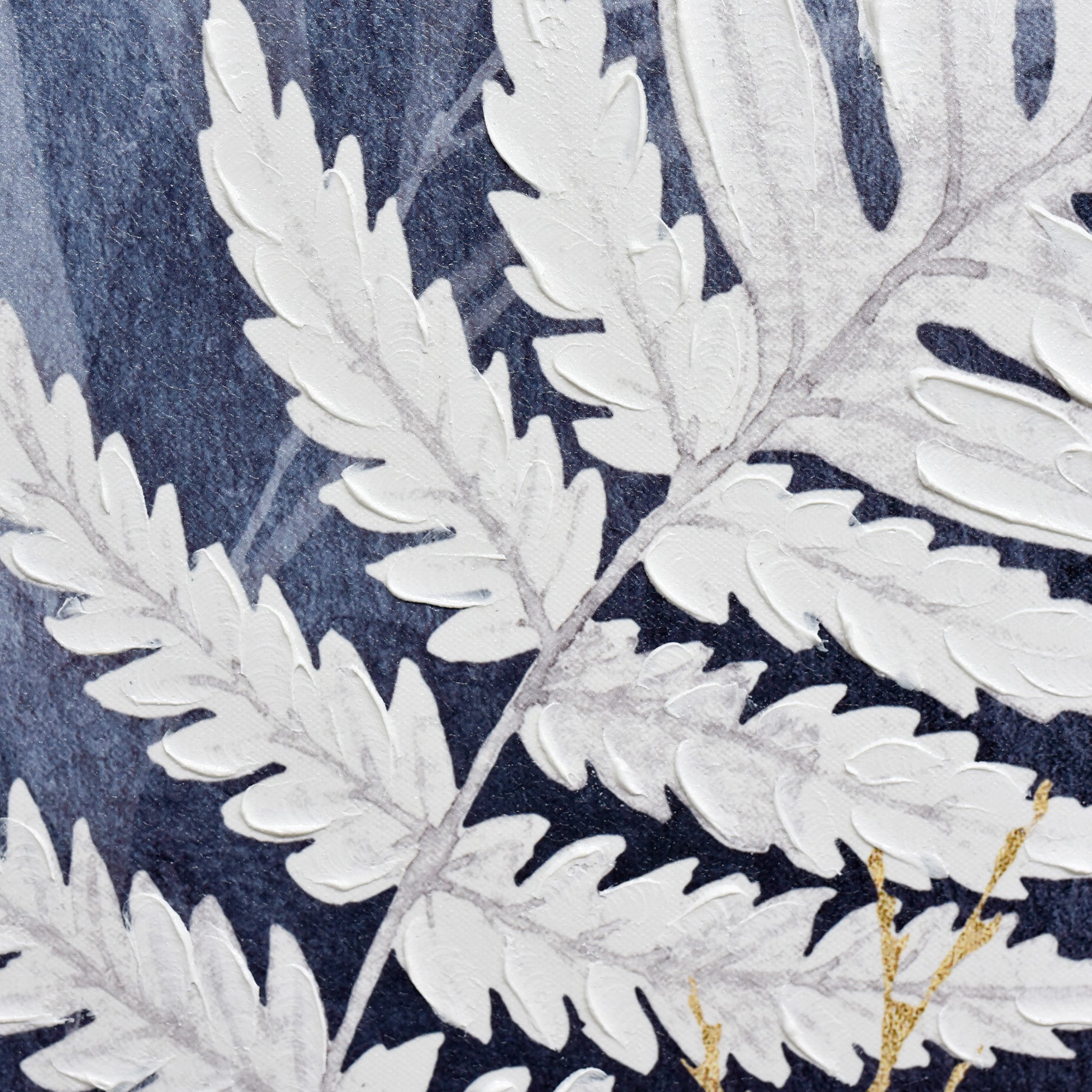 Dive into the ethereal beauty of nature with "Lustrous Foliage." This 70cm x 100cm artwork offers a striking contrast between the shimmering gold and white upright foliages and the dreamy shades of blue that serve as their backdrop. As your gaze moves across the canvas, you'll encounter a gradient of blue tones, transitioning from light to dark, evoking the tranquility of a twilight sky. The blue hues gently blot and meld into a pristine white background, adding depth and a sense of space to the composition. The delicate blend of hand-painting and print brings the foliages to life, making them stand tall and proud amidst the serene surroundings. Encased in a sophisticated dark wood frame, "Lustrous Foliage" is a testament to the harmonious interplay between color and form, capturing the essence of nature's elegance.