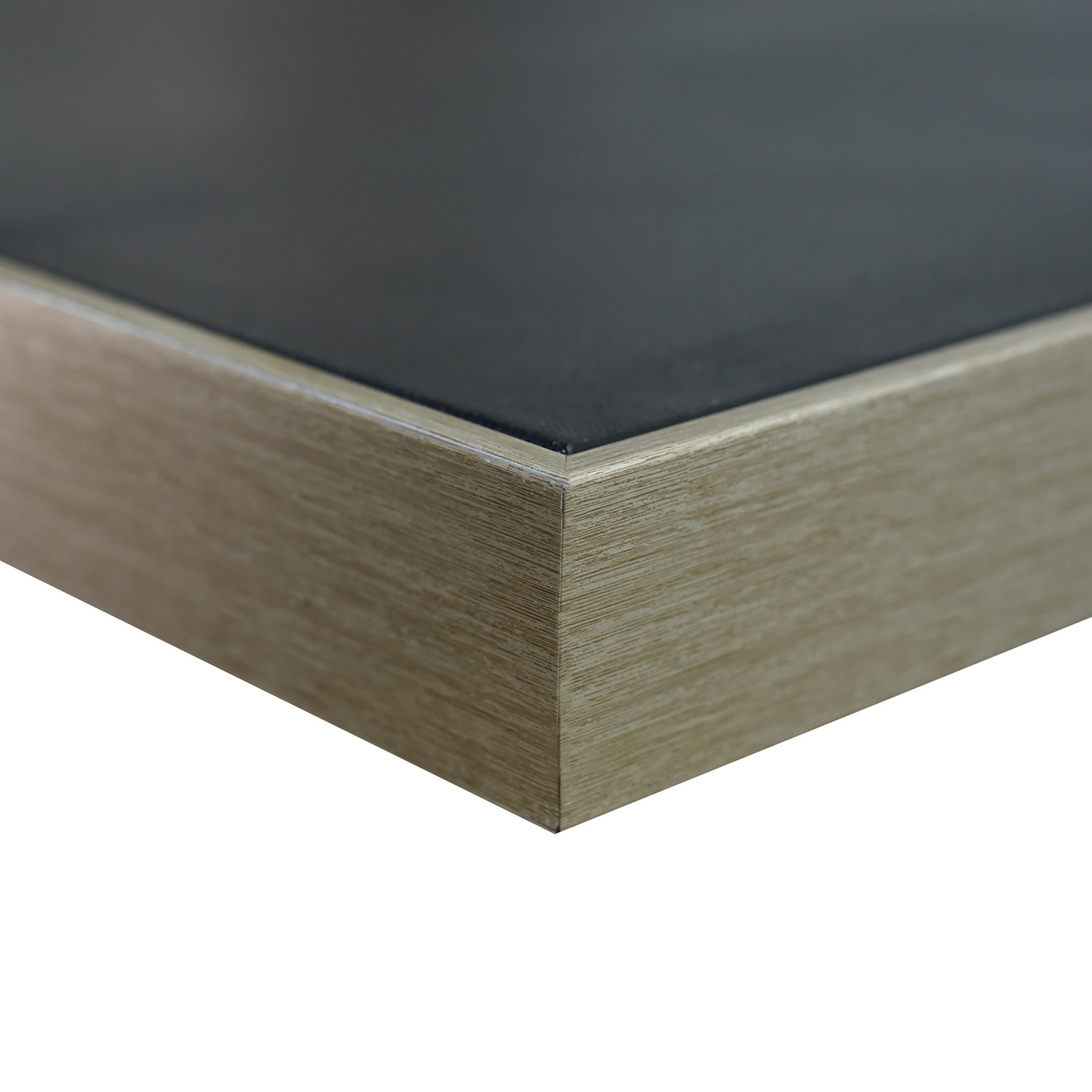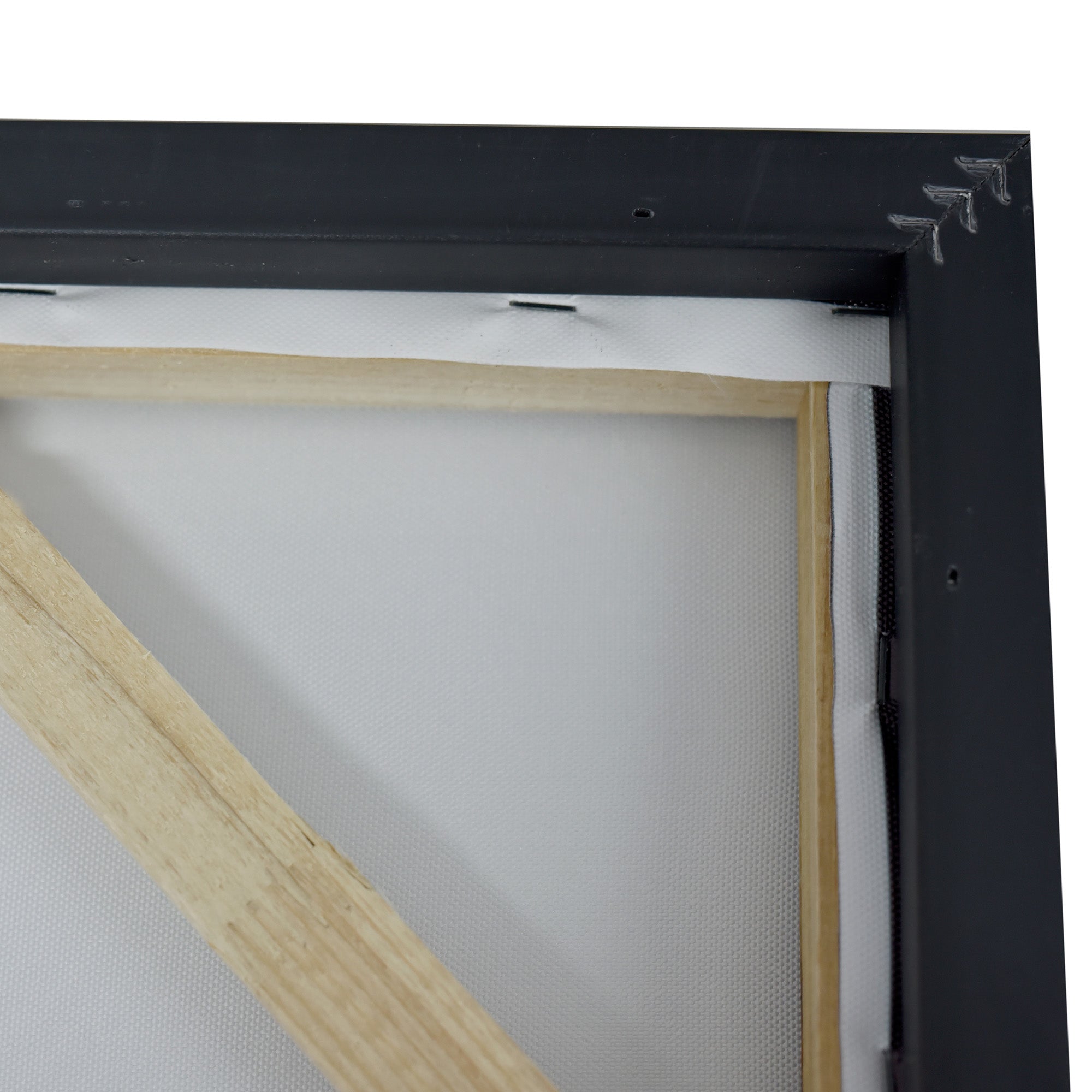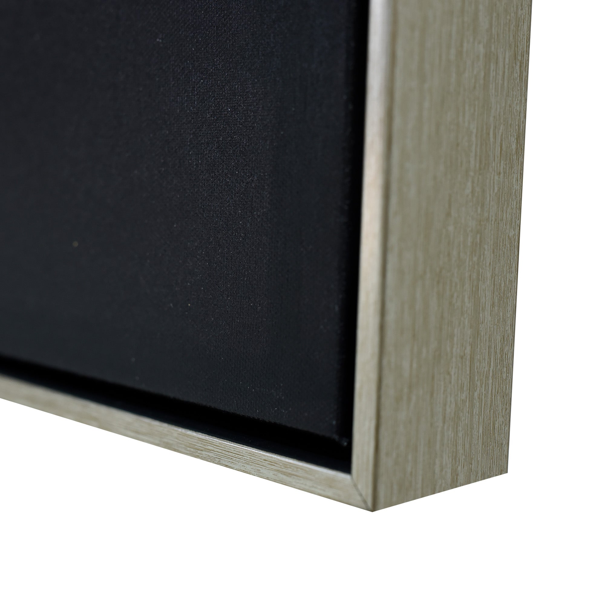 Stretched and gallery wrapped around a wooden stretcher and finished with a floating frame. There is a gap between the frame and print, which creates the floating effect and literally makes the canvas print stand out even more.