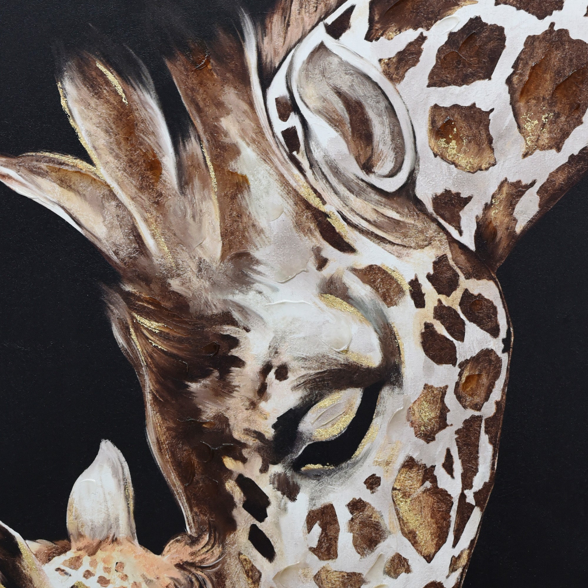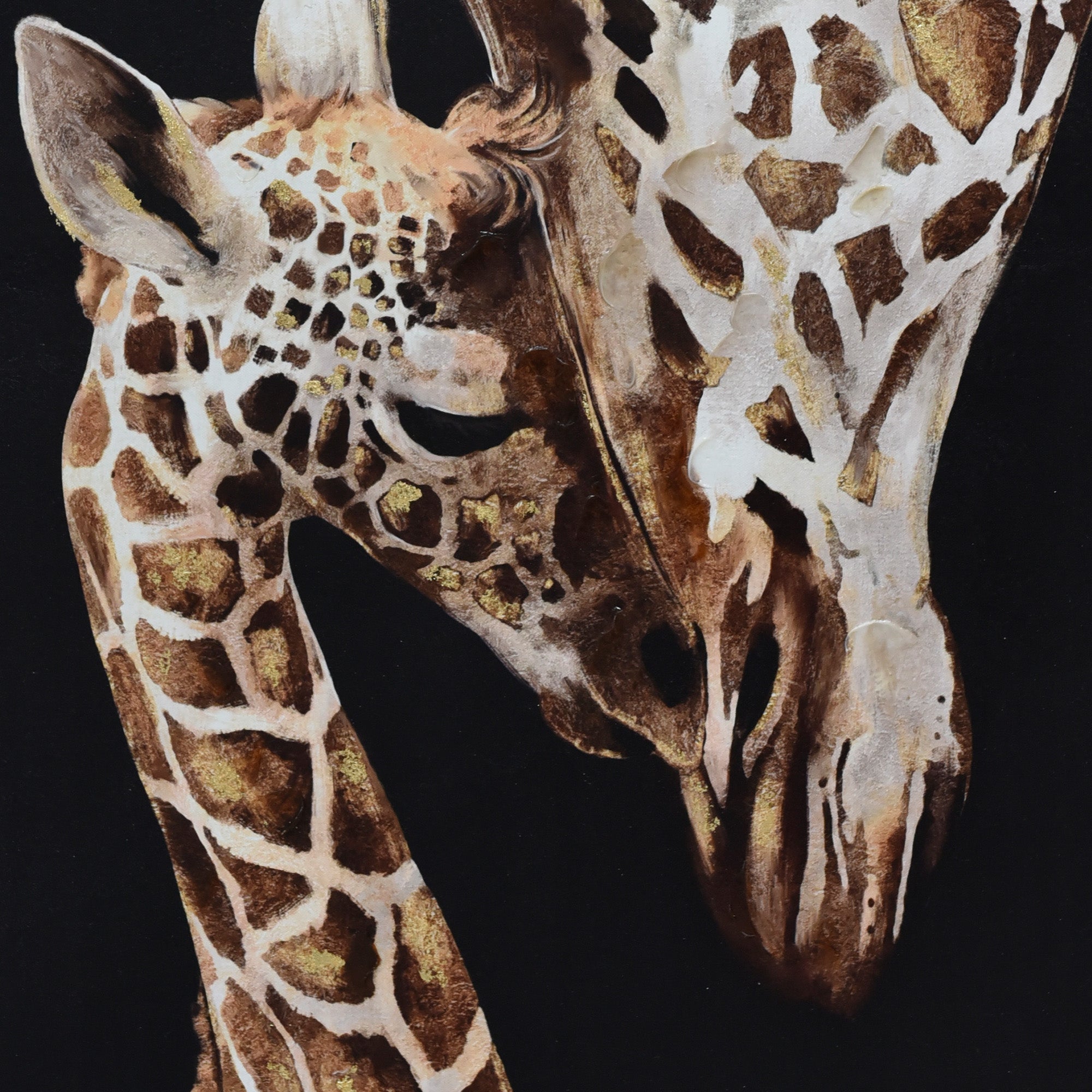 "Tender Touch" is a poignant portrayal of the bond between mother and child. Set against a stark black backdrop, two giraffes emerge as the focal points, their heads gently touching in a moment of pure affection. The adult mother giraffe, regal and protective, leans towards the younger one, their eyes closed as if savoring the moment. The baby giraffe, innocent and trusting, reciprocates this gesture, symbolizing the universal language of love and care. The artwork's contrast between the deep black background and the detailed portrayal of the giraffes creates a powerful visual impact, drawing viewers into the emotional depth of the scene. Encased in a champagne-hued frame and crafted with a harmonious blend of hand-painted elements and print, "Tender Touch" stands as a testament to the timeless and profound connection between a parent and their offspring.