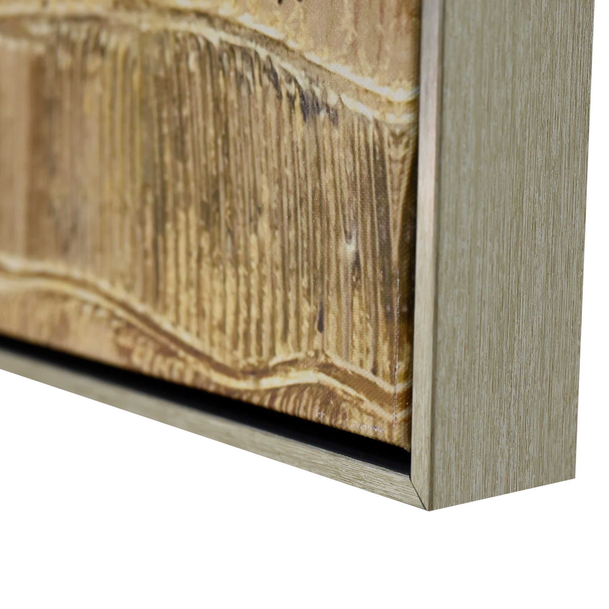 Stretched and gallery wrapped around a wooden stretcher and finished with a floating frame. There is a gap between the frame and print, which creates the floating effect and literally makes the canvas print stand out even more.
