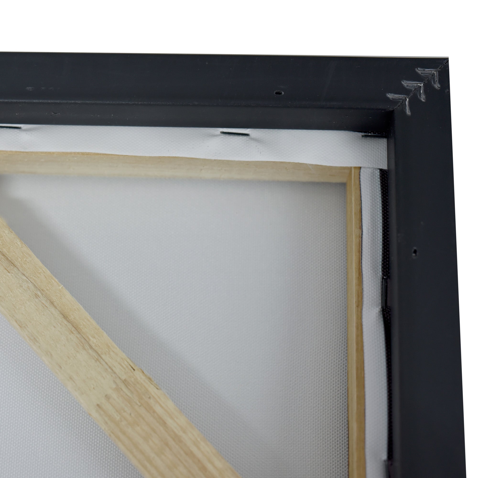 Stretched and gallery wrapped around a wooden stretcher and finished with a floating frame. There is a gap between the frame and print, which creates the floating effect and literally makes the canvas print stand out even more.