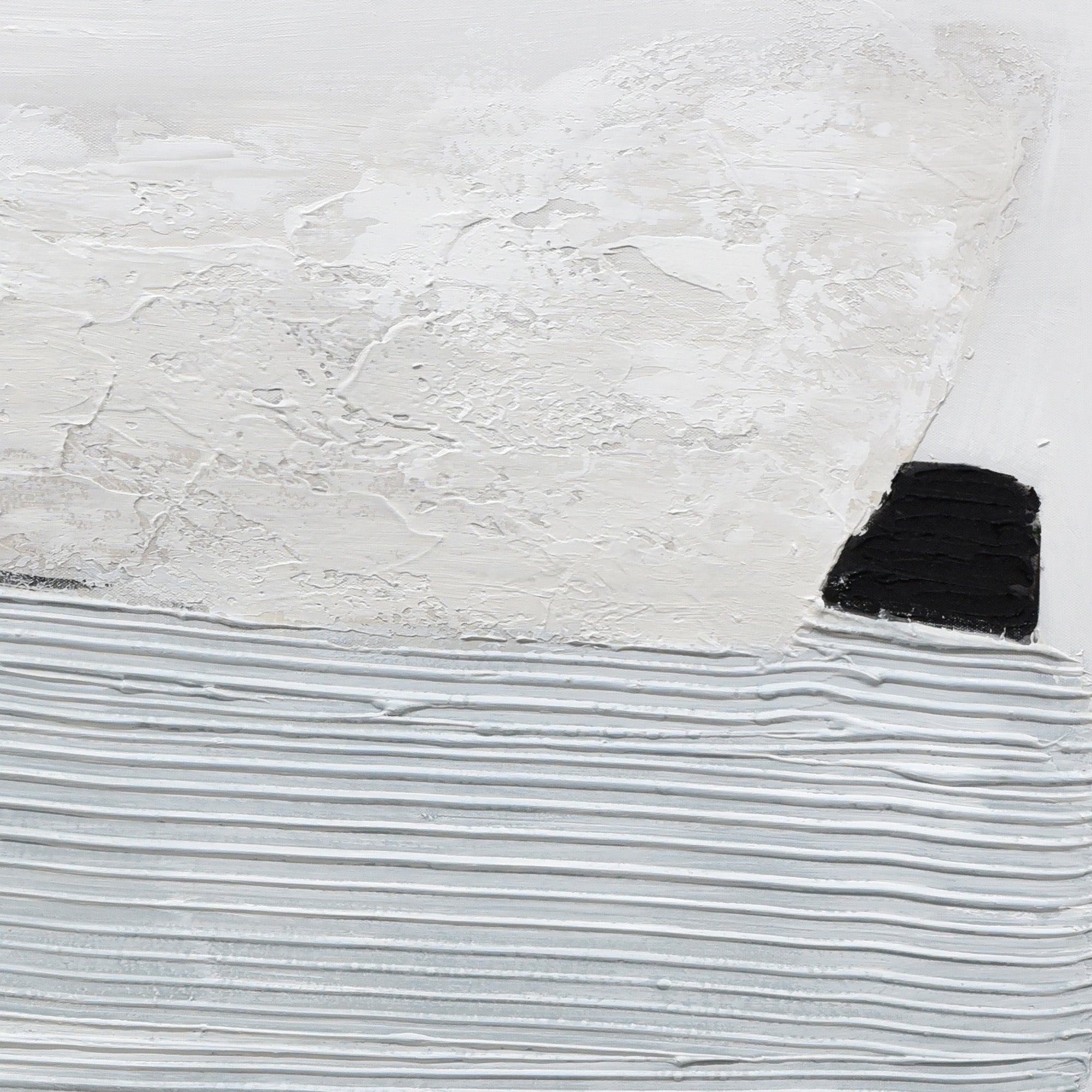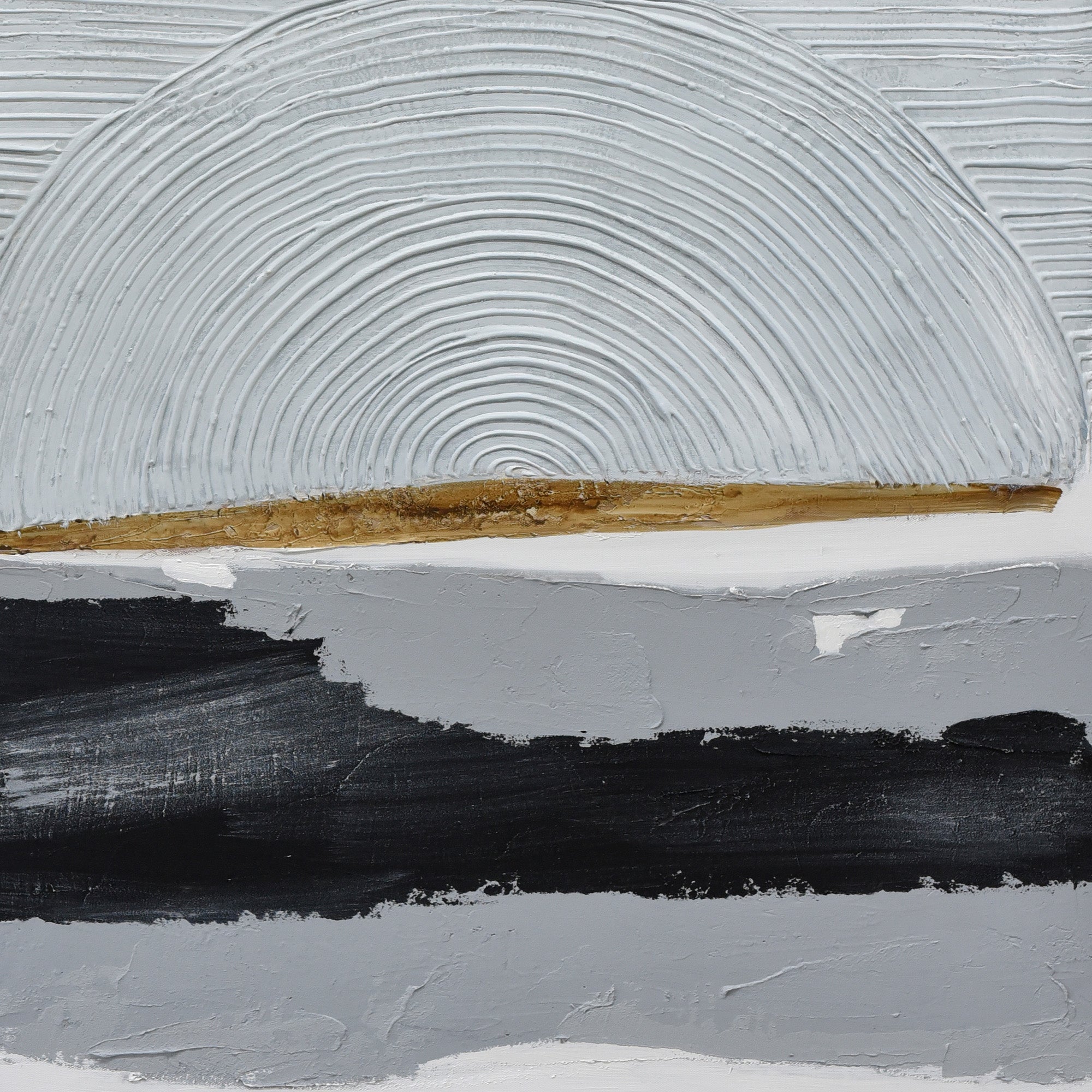 "Vibes of Vellichor" isn't merely art—it's an attitude. Its thick textures and playful contrasts set the stage for a visual dance, encapsulating the vibrancy and dynamism of modern life. Standing before it, one is compelled to groove to its rhythm, to muse, and to lose oneself in its funky narrative. Front and center, a prominent white dash pops against the canvas, acting as a contemporary guide through the labyrinth of hues. Whimsical baby blue grooves, both circular and linear, pirouette around this dash, channeling vibes of cool summer breezes and ocean waves. Moodier shades of grey and deep charcoal layer in, adding complexity and a hint of urban chic. The piece is masterfully unified by a dashing line of gold, a gleaming streak that screams modern luxury.