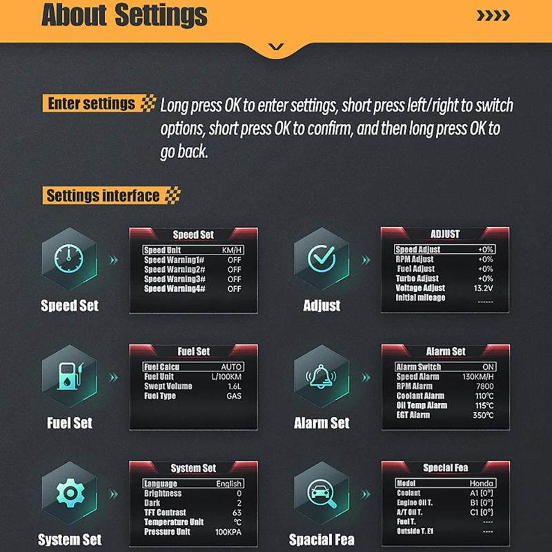 • Special car mode with additional functions such as oil temperature, transmission oil temperature, and vehicle outside temperature