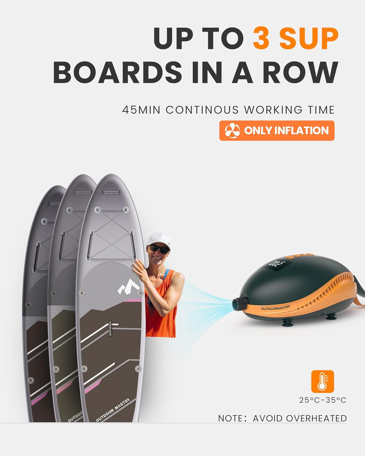 Easily set and track your desired pressure with the Outdoor Master Electric Paddle Board Pump. Just press the + or - button, and the digital display will show the current and target pressure in real time. Inflation made simple!