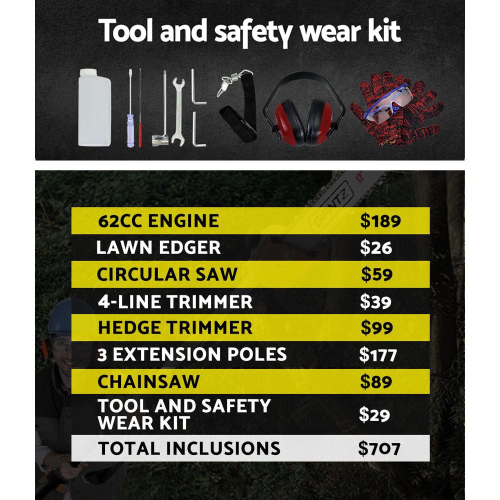 Giantz 62CC Pole Chainsaw Hedge Trimmer Brush Cutter Whipper Saw Snipper 7-in-1