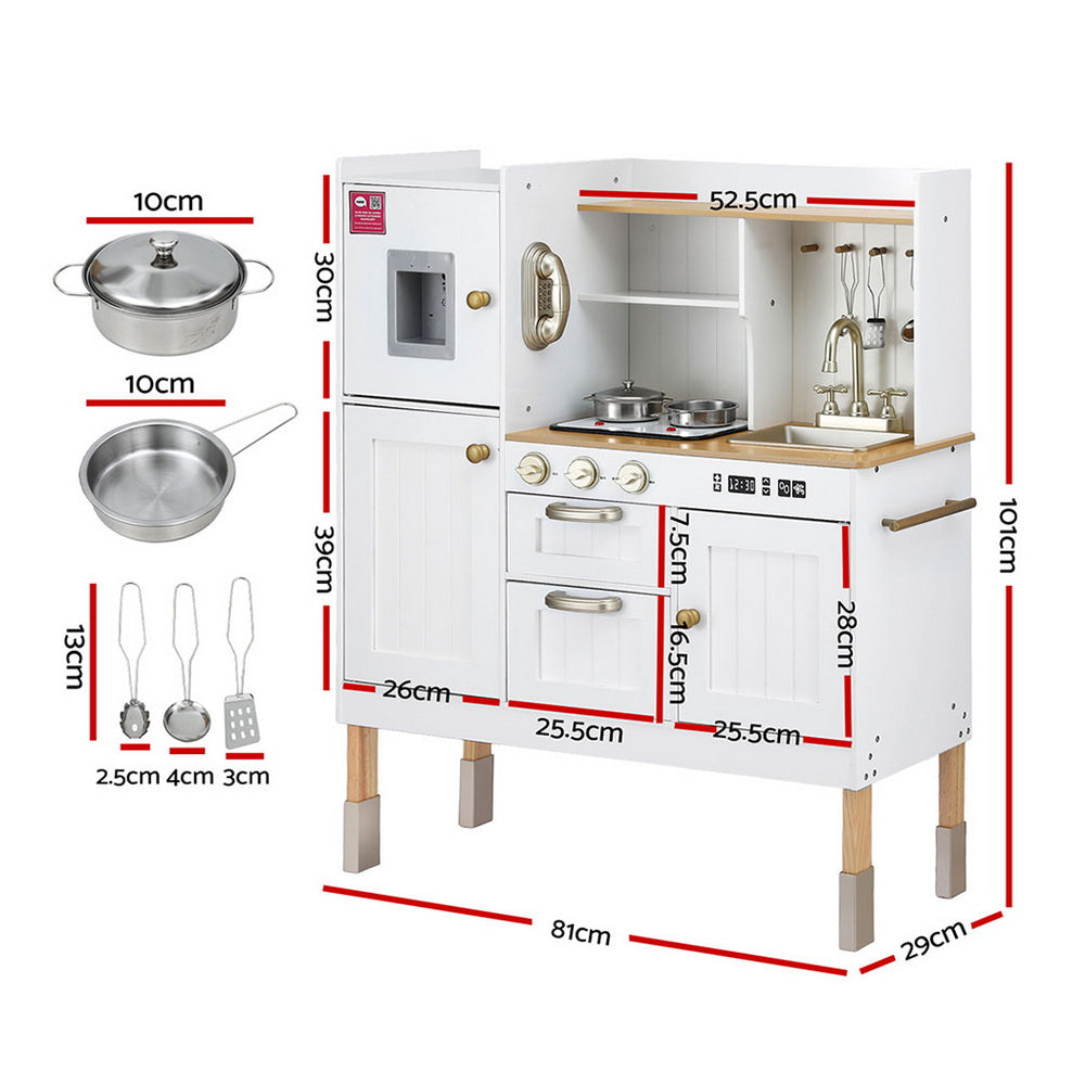 Bring your little chef's imagination to life with this realistic kids' play kitchen set! It offers a realistic cooking experience with multiple functions, detachable sink, cute phone, and water dispenser for interactive fun. Built with sturdy construction and a non-toxic paint finish, it's safe and durable for everyday play. Features ample storage space, easy-to-clean surfaces, and simple assembly for parents' convenience. EN71 certified for toy safety. Recommended for ages 3+, with adult supervision advised.