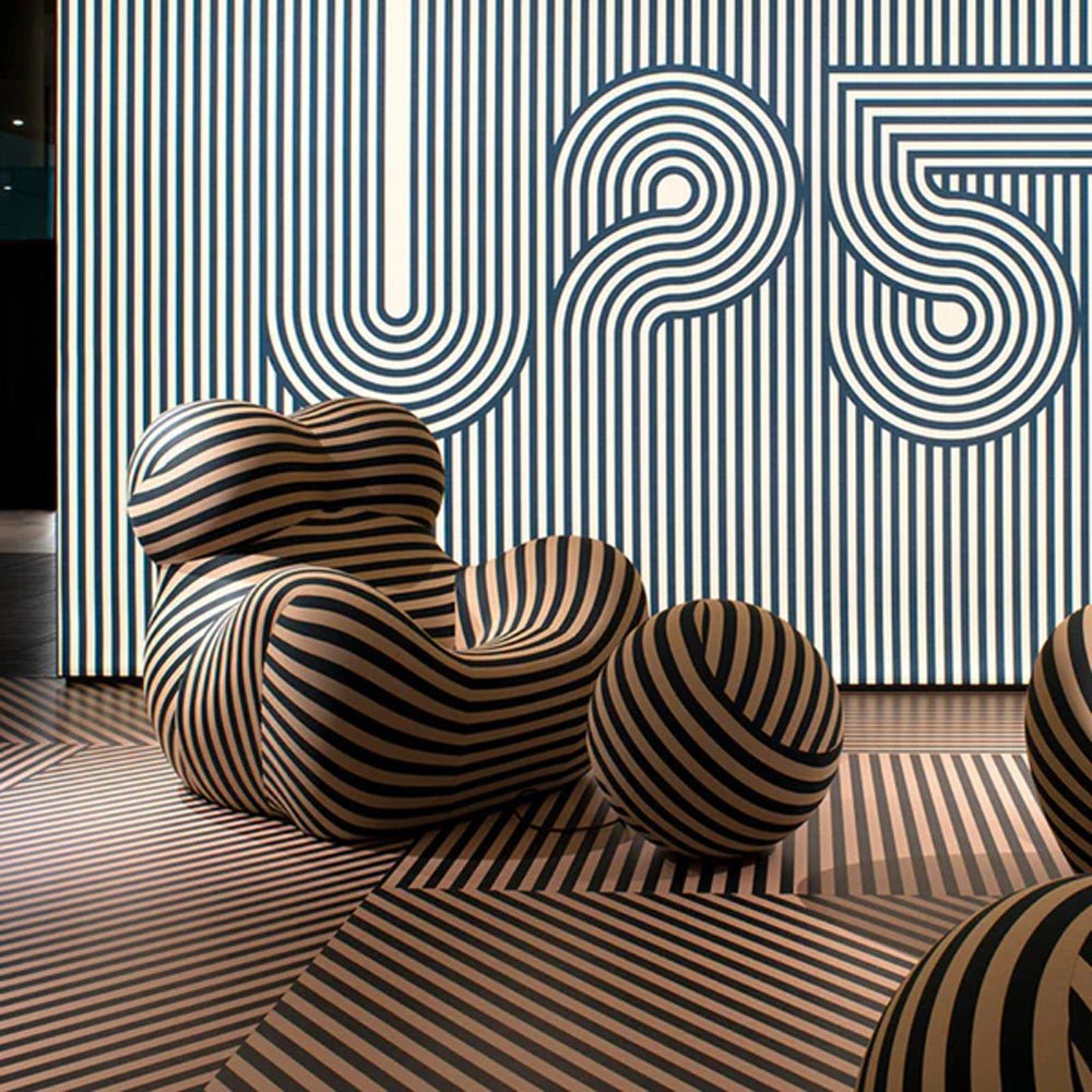 Experience a blend of bold design and comfort with the Retro Up Lounge Chair - Ball and Chain, originally created by Gaetano Pesce in 1962. This captivating replica features generous and fluid curves wrapped in an elastic polyester striped fabric that highlights its retro charm. The high-density foam core, with three distinct foam densities, offers perfect harmony between softness and durability, making it feel like you're sitting on a cloud. The playful "Ball and Chain" design connects the round ottoman to the chair with a cord, making it as functional as it is visually striking. Perfect for your living room, bedroom, or lounge, this iconic piece is sure to captivate family and friends alike.