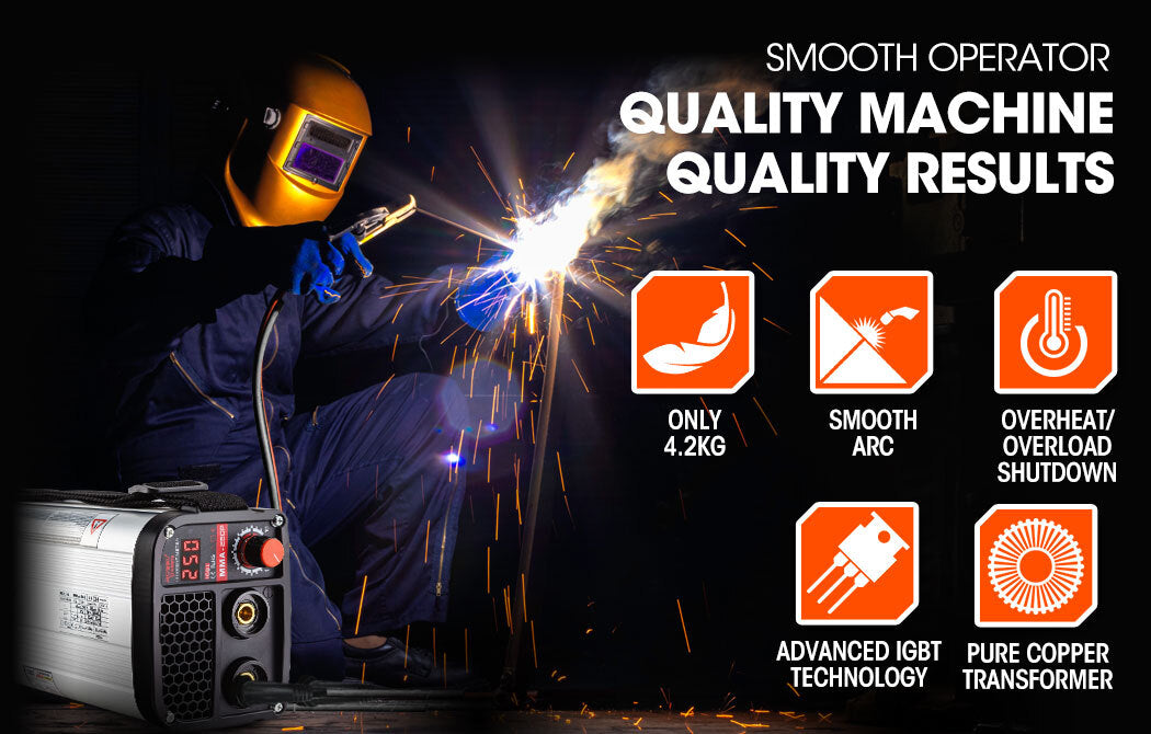 This highly efficient ‘go anywhere’ stick welder is adjustable from 20-250A producing flawless results - even with sheet metal. It features a convenient digital LCD display, on-the-fly current control, a shoulder strap and a range of accessories. A must have for any tradesman or handyman, the entire ROSSI range has a proven track record of innovation, performance and reliability. The MMA-250P is the perfect solution for no-fuss, precision welding wherever it needs to be done.