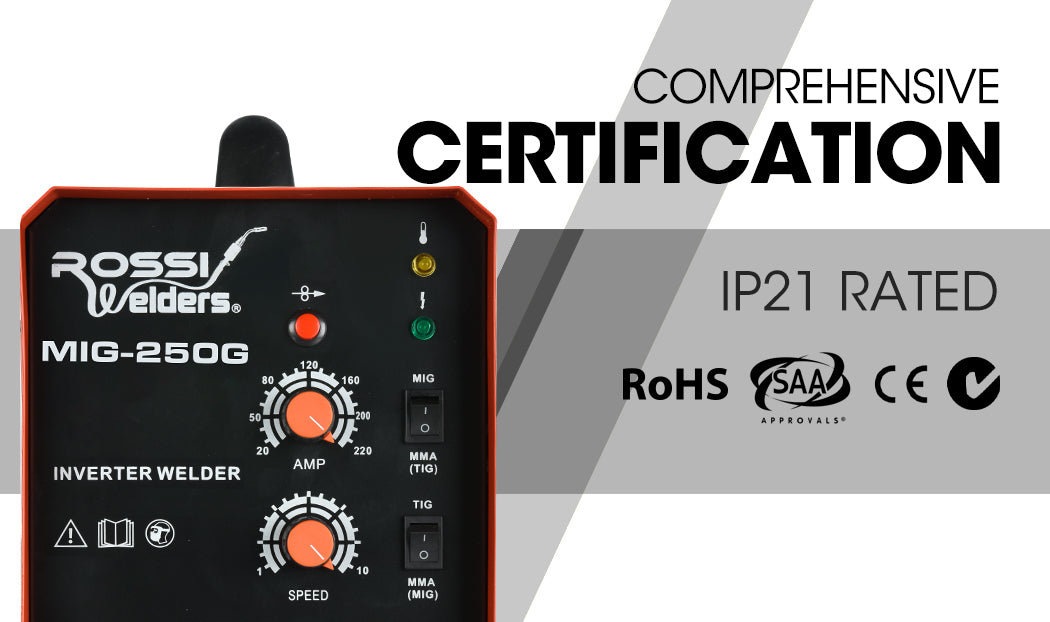 The new ROSSI MIG-250G Multiprocess Inverter Welder is capable of welding or joining just about anything. This MIG welder handles MIG/TIG and MMA/ARC producing smooth accurate work - the MIG-250G is the master of metals!