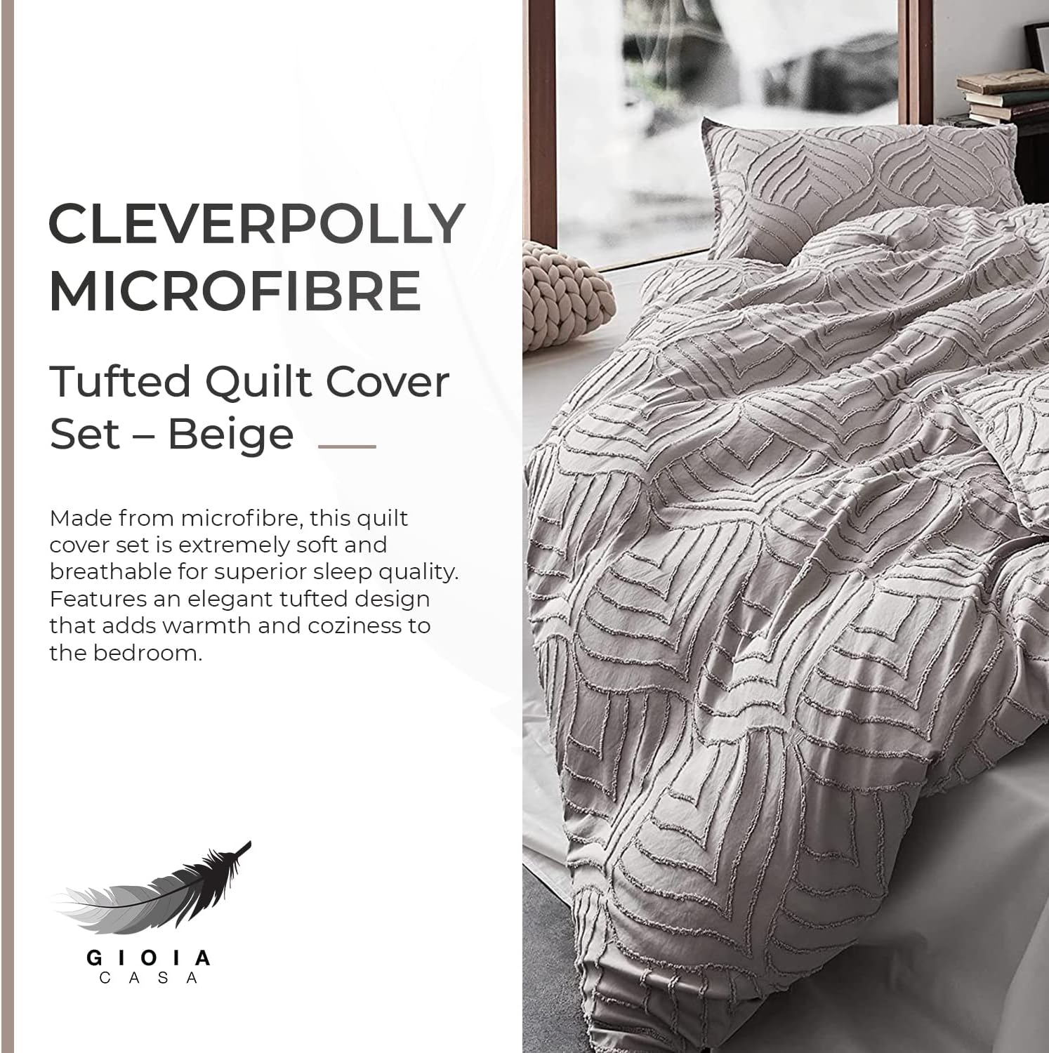 100% Premium Tufted Microfibre Quilt Cover Set - Ultra-Soft, Durable Embroidery Bedding Comforter Set - Machine Washable & Zipper Closure - Beige - King