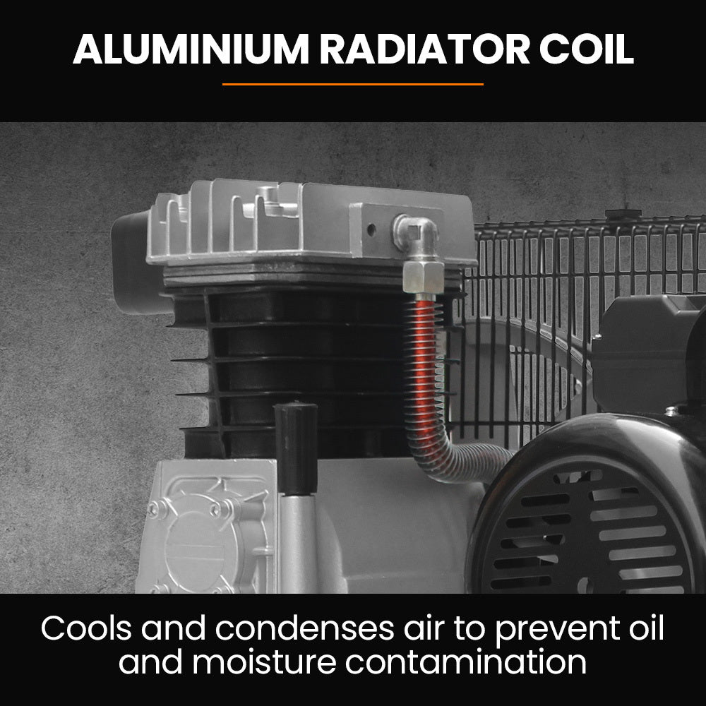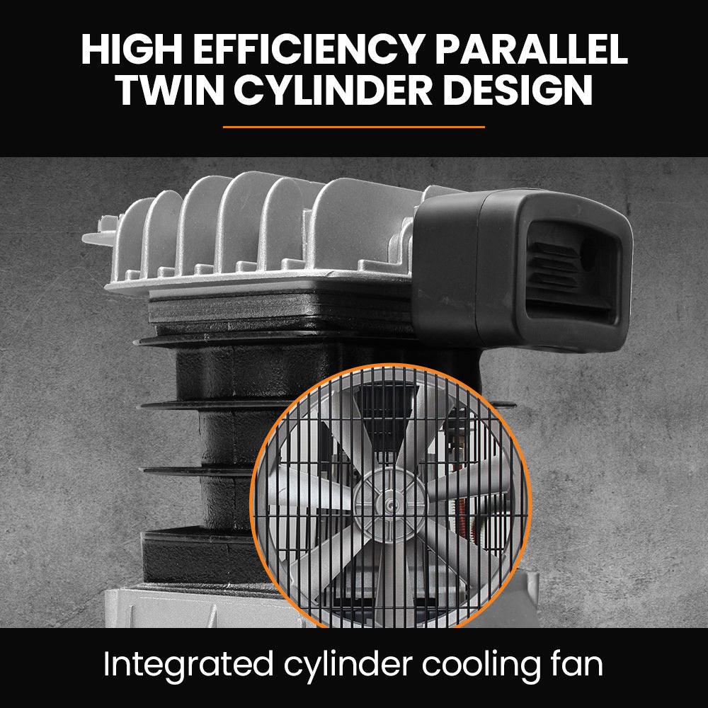 The heart of this machine is a robust cast iron parallel twin-cylinder compressor with aluminium pistons. An integrated aluminium heat exchanger cools the output air, assisted by the integrated fan in the drive pulley, ensuring less moisture and contamination in your air hose. The cooler output air temperature also contributes to the compressor's overall efficiency and performance. The unit also features a pump speed of 920 rpm and a duty cycle of 0.75, ensuring consistent and reliable performance. The pump has an outstanding air displacement of 280L/Min (9.9 CFM), giving it powerful air delivery for demanding applications.