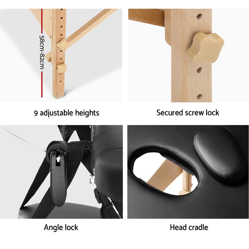 Zenses Massage Table 60cm Portable 3 Fold Wooden Beauty Bed Black
